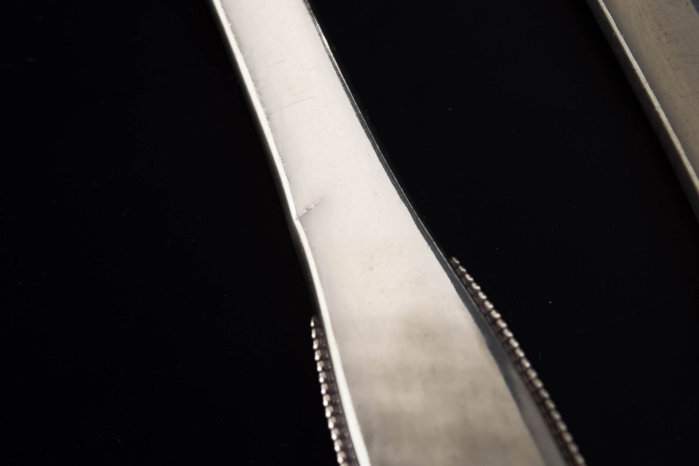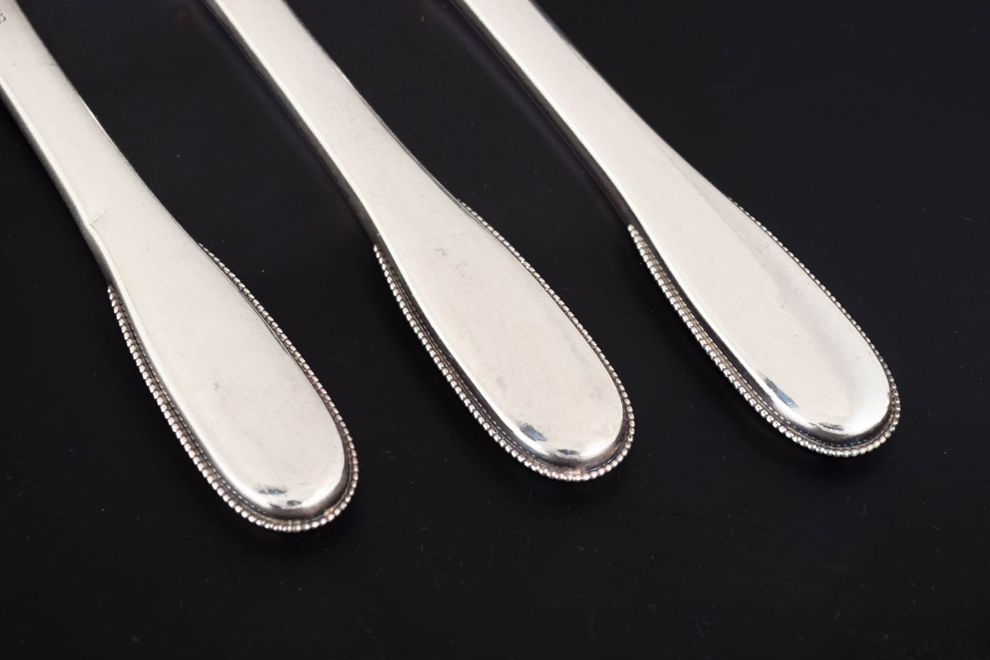 Evald Nielsen, tre middagsknive. Model nummer 14.Elegante middagsknive i sterlingsølv og rustfrit stål. Model nummer 14 med klassisk, let afrundet skaftform med diskret perlekant og glat klinge. Fremstillet hos Evald Nielsen.
