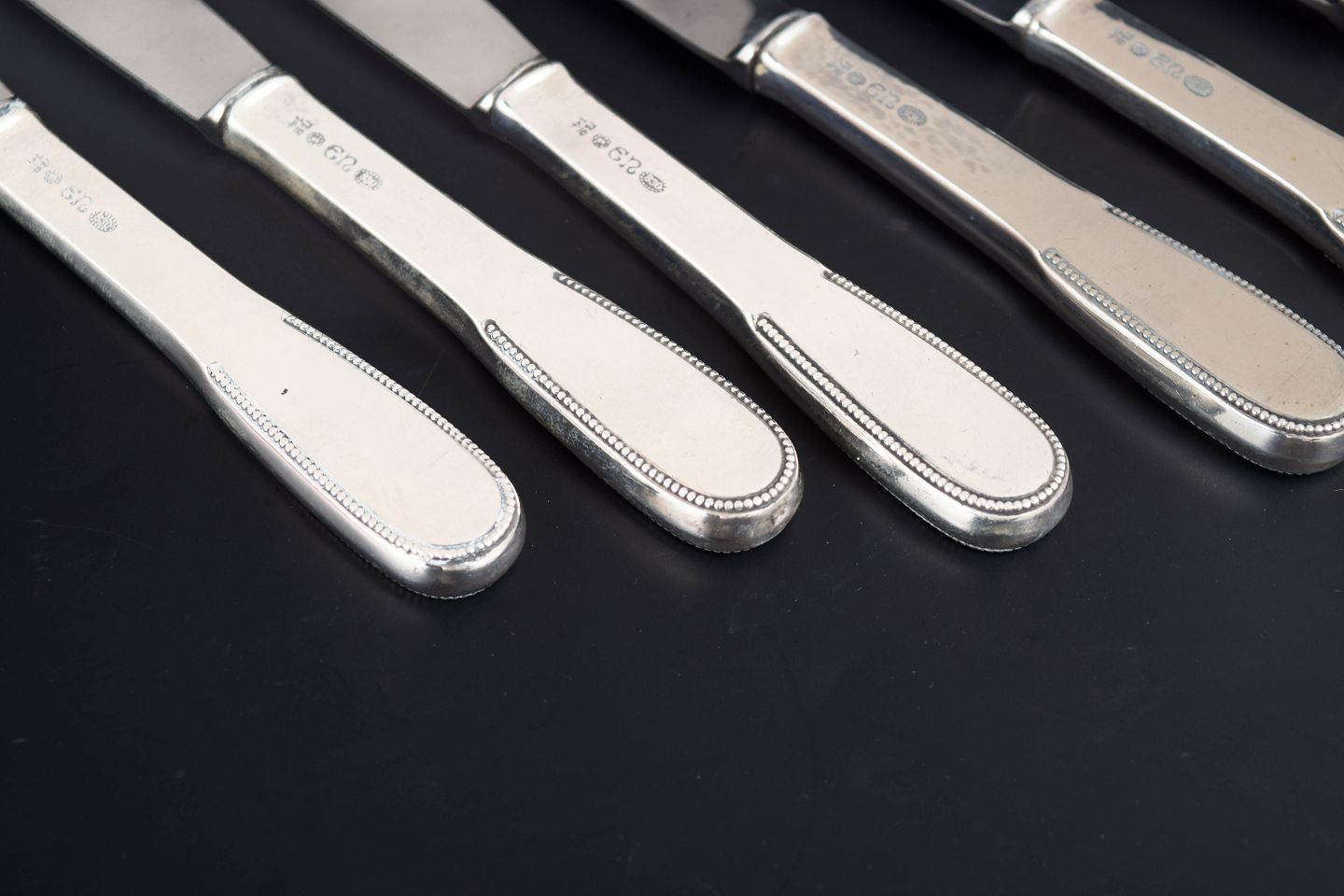 Evald Nielsen frokostknive, sæt af seks. Model nummer 14.Elegante frokostknive i tretårnet sølv og rustfrit stål. Model nummer 14 med klassisk, let afrundet skaftform med diskret perlekant og glat klinge. Fremstillet hos Evald Nielsen.