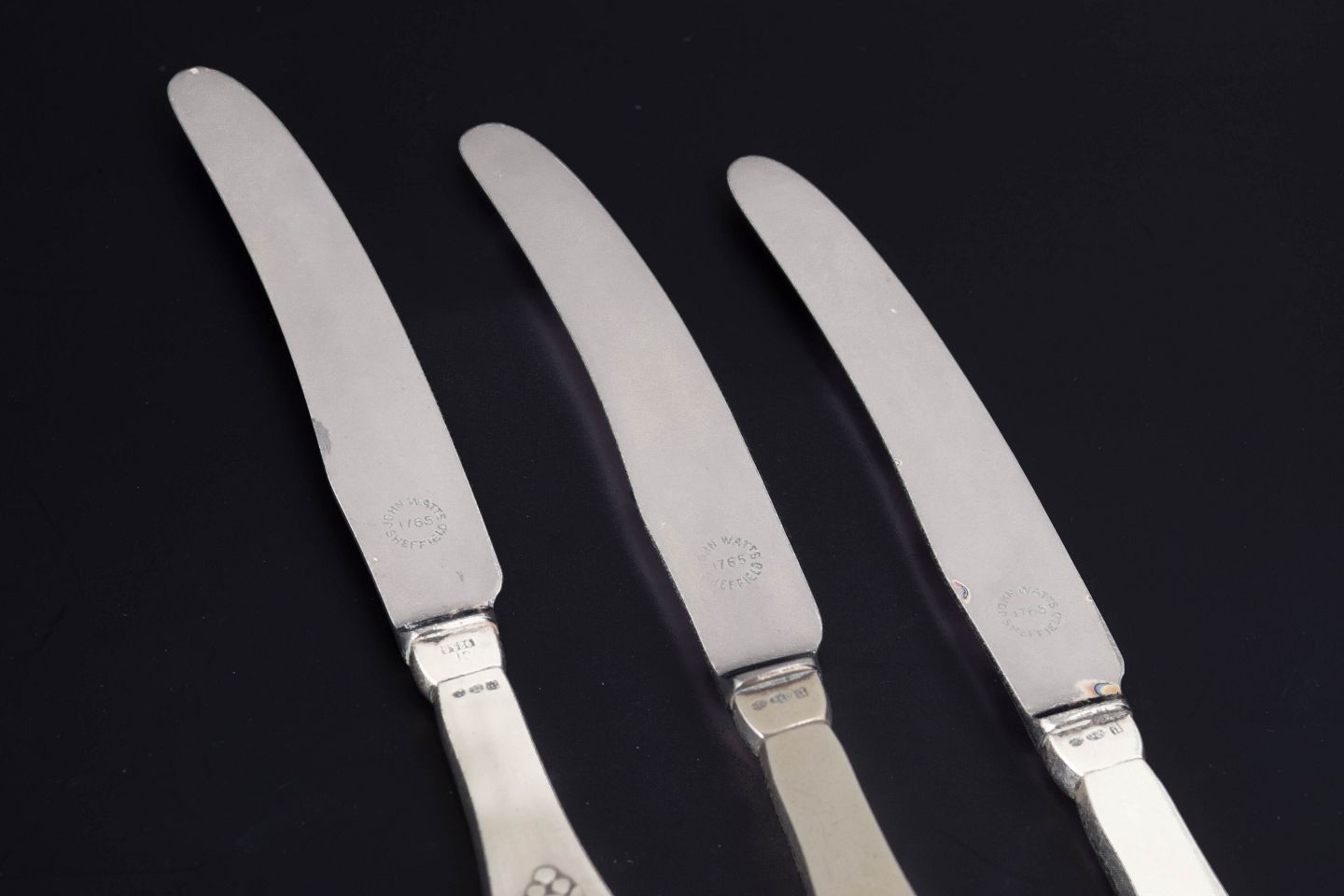 Georg Jensen, sæt af tre frugtknive, Klokke.Sæt af tre frugtknive i rustfrit stål og sterlingsølv i mønstret Klokke fra Georg Jensen. Skaftet er dekoreret med et stiliseret blomstermotiv inspireret af fuchsiaen, udført i relief med bløde organiske linjer, karakteristisk for Georg Jensens tidlige jugendstil.