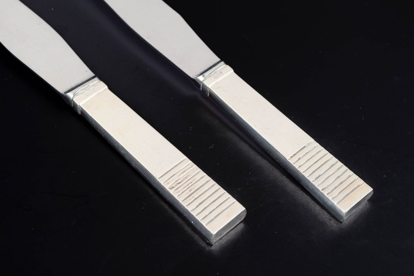 To frokostknive i rustfrit stål og sterlingsølv i modellen Relief fra Georg Jensen. Knivene har slanke blade i rustfrit stål og karakteristiske sølvskaft med parallelle rillede felter nederst på skaftet, et stramt og modernistisk design fra efterkrigstiden.