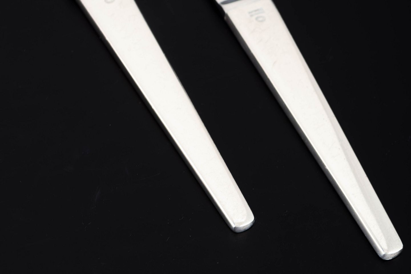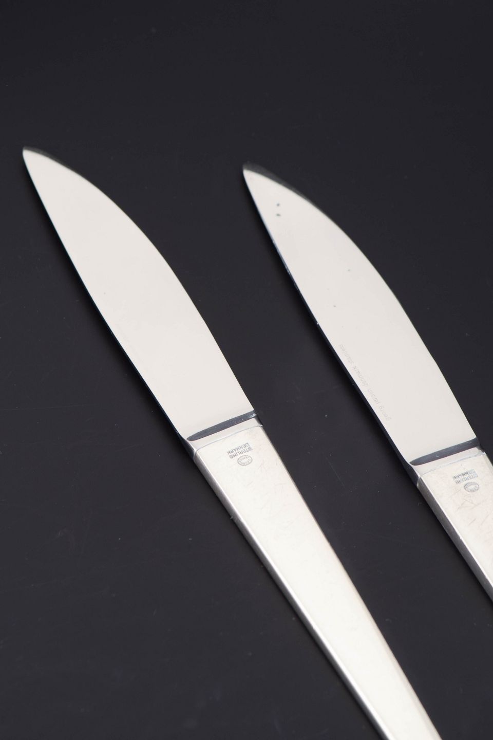 Henning Koppel for Georg Jensen, to frokostknive Caravel.To frokostknive i rustfrit stål og sterlingsølv i modellen Caravel, designet af Henning Koppel for Georg Jensen. Bestikket er udført i et stramt og elegant formsprog med slanke linjer og let konisk form, karakteristisk for Koppels modernistiske design.