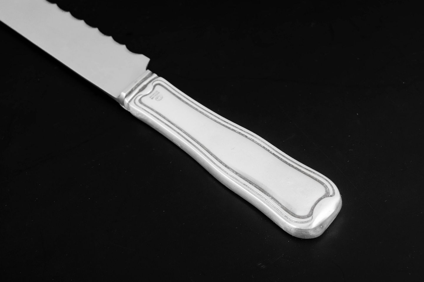 Georg Jensen, brødkniv, Dobbeltriflet.Brødkniv i rustfrit stål og sterlingsølv med skaft i mønstret Dobbeltriflet. Kniven har en lang savtakket klinge i rustfrit stål, velegnet til brød, og et elegant sølvskaft med de karakteristiske dobbelte rifler langs kanten. Et klassisk bestikdesign fra Georg Jensen.