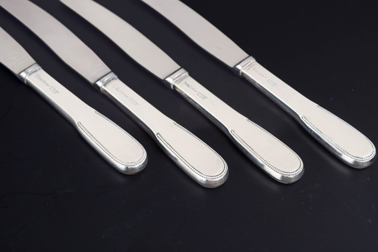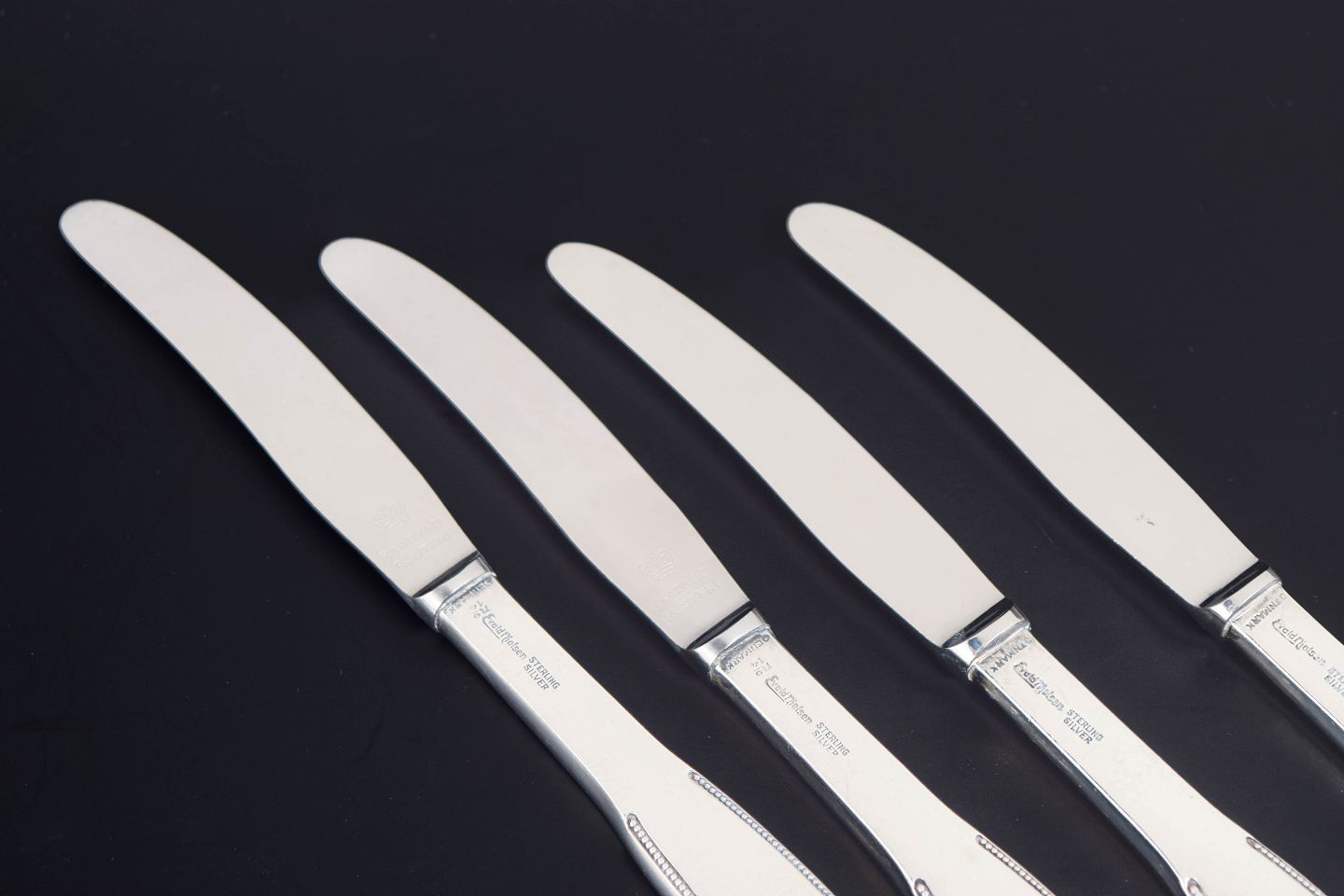 Evald Nielsen frokostknive, sæt af fire.Elegante frokostknive i sterling sølv og rustfrit stål. Model nummer 14 med klassisk, let afrundet skaftform og glat klinge. Fremstillet hos Evald Nielsen, længde 17,7 cm.