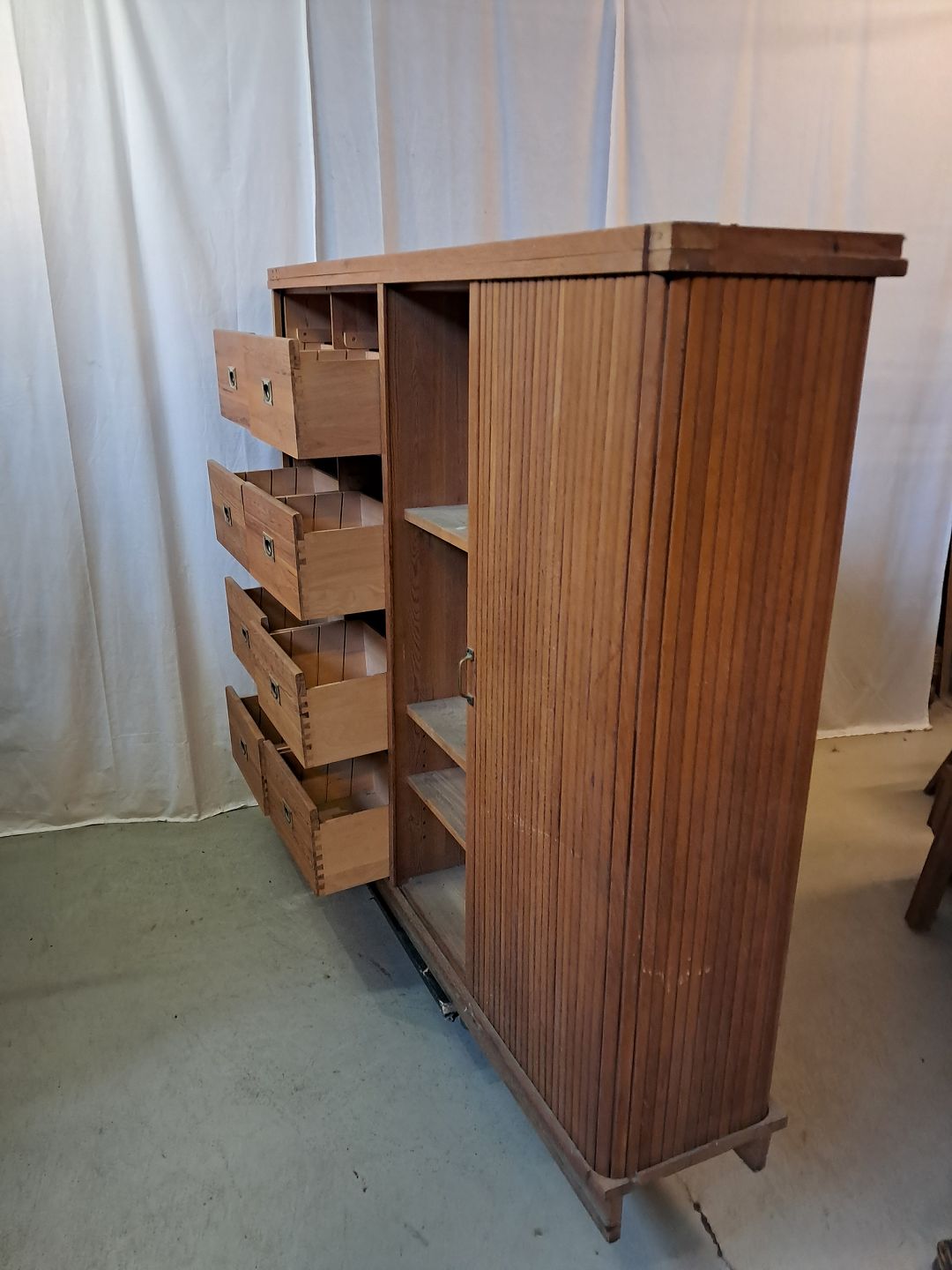 Jalousiskab i fineret egetræ, fra 1950erne.Det har brugsspor og defekte jalousilåge.