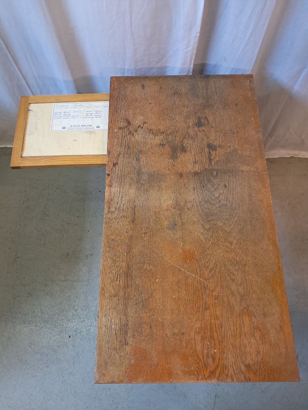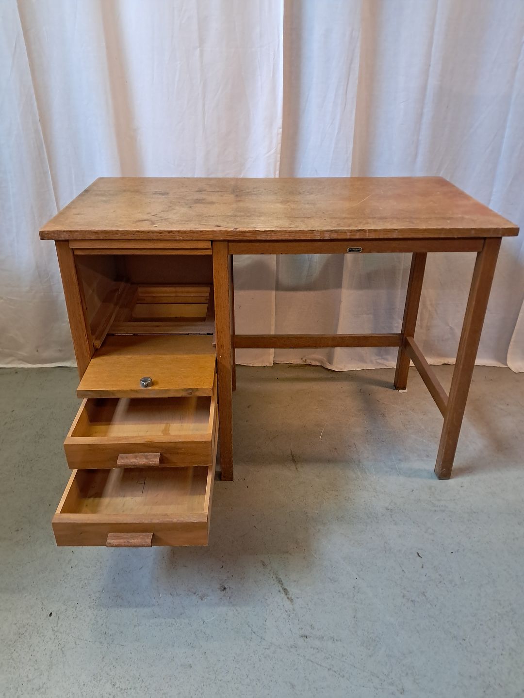 Børne skrivebord i fineret egetræ, fra 1950erne.Det har brugsspor.