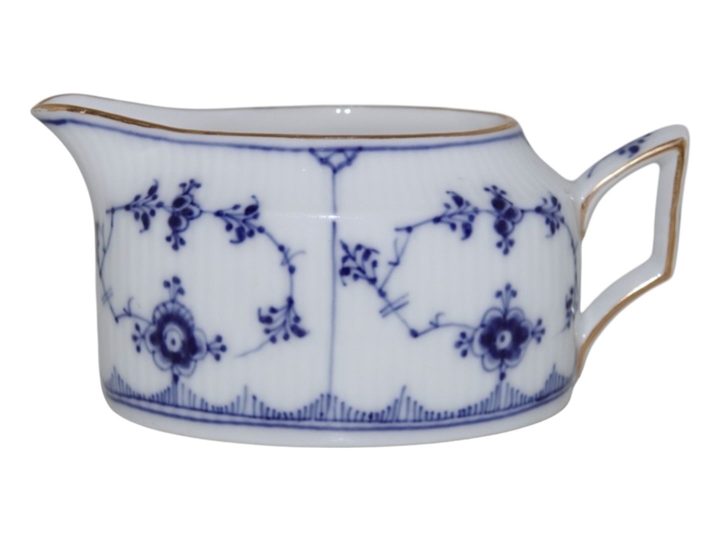Royal Copenhagen Musselmalet Riflet med guldkant, sjælden, oval flødekande.Af fabriksmærket kan det udledes, at denne er produceret mellem 1898 og 1923.