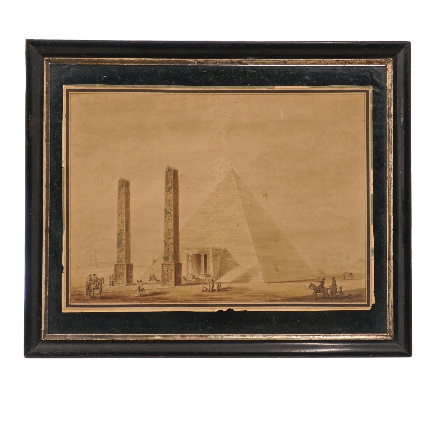 Ubekendt kunstner 1800-tallet: Egyptisk parti med pyramider og obeliskerMixed media, pen og akvarel