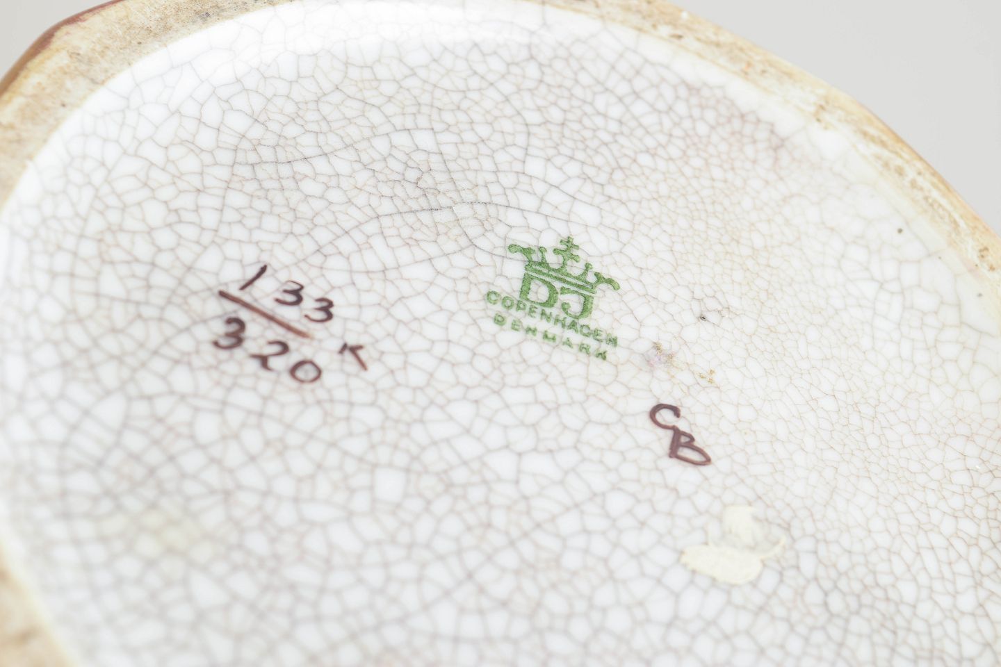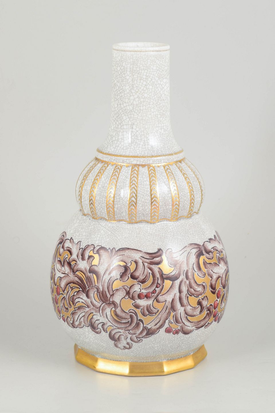 Dahl-Jensen art deco porcelænsvase.Elegant porcelænsvase med høj slank hals og balusterformet korpus dekoreret med reliefagtige ornamenter i guld og polykrome toner mod en krakeleret glasur. Formen og dekorationen afspejler den dekorative stil fra art deco-perioden. Modelnummer 133/320, stemplet Dahl-Jensen København i bunden.