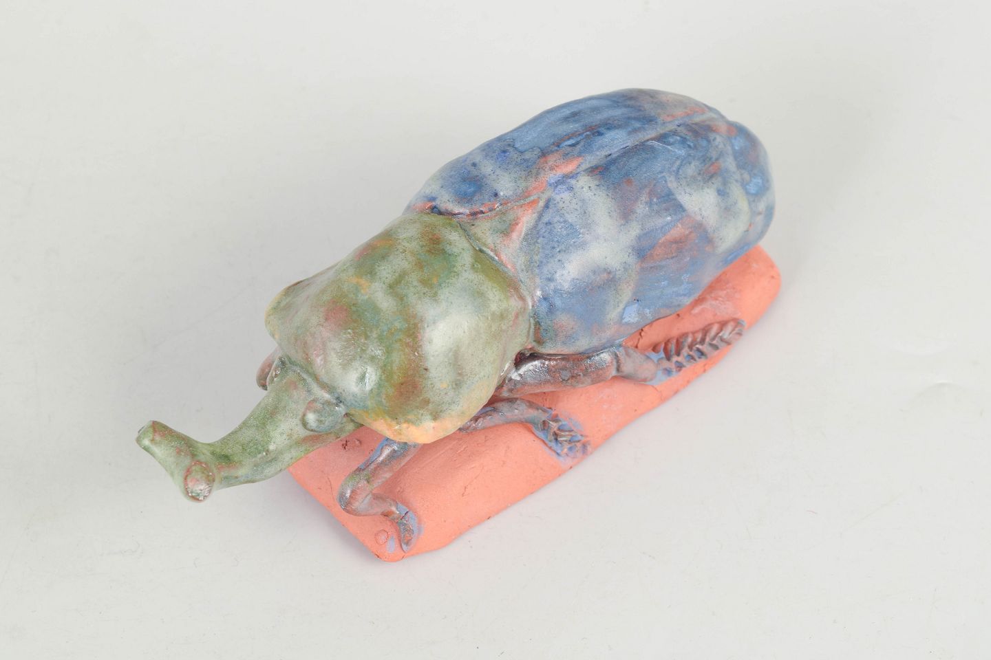 Nils-Erik Zetterström, insect figure.Unique ceramic sculpture depicting an insect executed in stoneware with multicoloured glaze in green, blue and brown tonal nuances. The figure is modelled with naturalistic detailing and placed on a small clay base, giving the piece a sculptural and lively character. Signed and dated 1978.