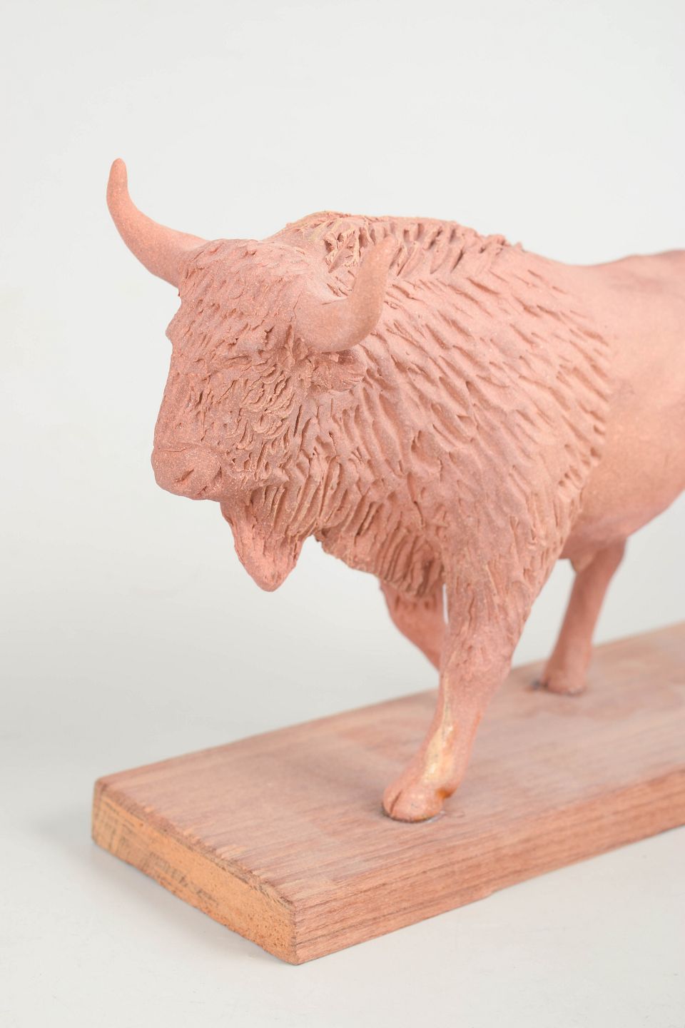 Nils-Erik Zetterström, tyre figur på træbase.Unik keramisk figur forestillende en tyr udført i uglaseret ler monteret på en rektangulær træbase. Figuren er modelleret i en dynamisk bevægelse med løftet ben og detaljeret pelsstruktur, hvilket giver et kraftfuldt og skulpturelt udtryk. Usigneret unika fra 1970’erne.