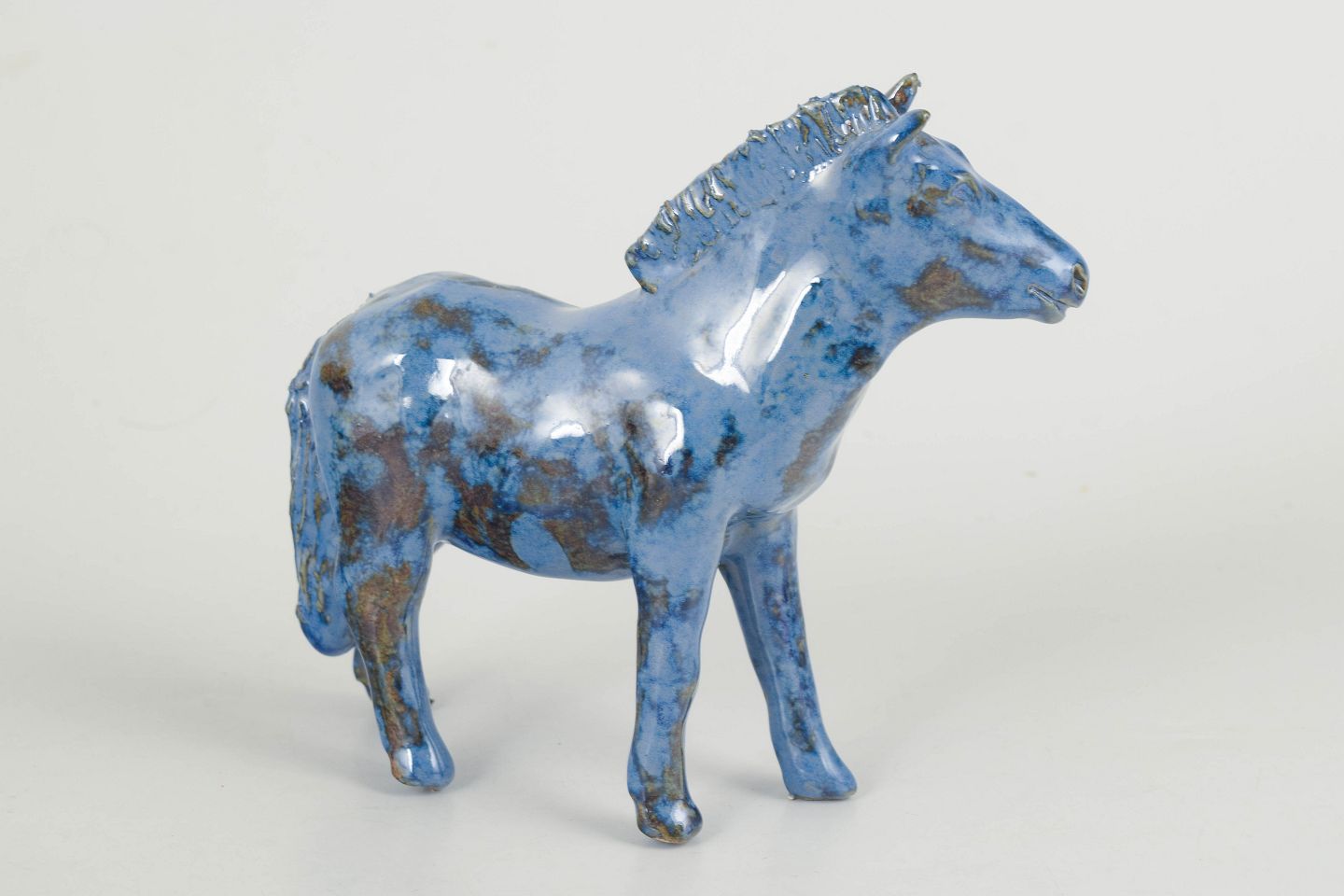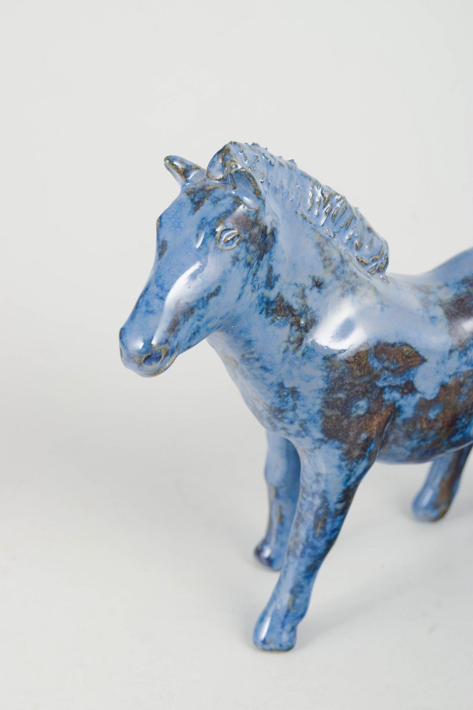 Nils-Erik Zetterström, føl figur.Unik keramisk figur forestillende et føl udført i stentøj med blank glasur i blå toner med brunlige nuancer. Figuren er modelleret med en naturlig kropsholdning og detaljeret manke og hoved, hvilket giver et levende og karakterfuldt udtryk. Usigneret unika fra 1970’erne.
