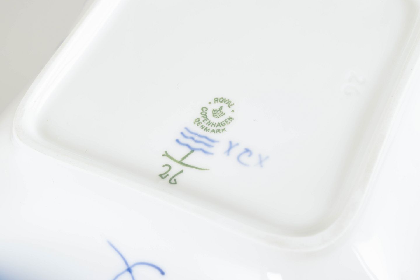 Royal Copenhagen Musselmalet Riflet, firkantet skål.Håndmalet firkantet skål i porcelæn dekoreret med det klassiske musselmalede riflet mønster i blå underglasur. Skålen har svagt buede sider med riflede detaljer og et centralt blomsterornament omgivet af slyngede blomstergrene. Undersiden er fabriksstemplet Royal Copenhagen og annulleret med én indridset streg gennem fabriksstemplet. Model 1/26.