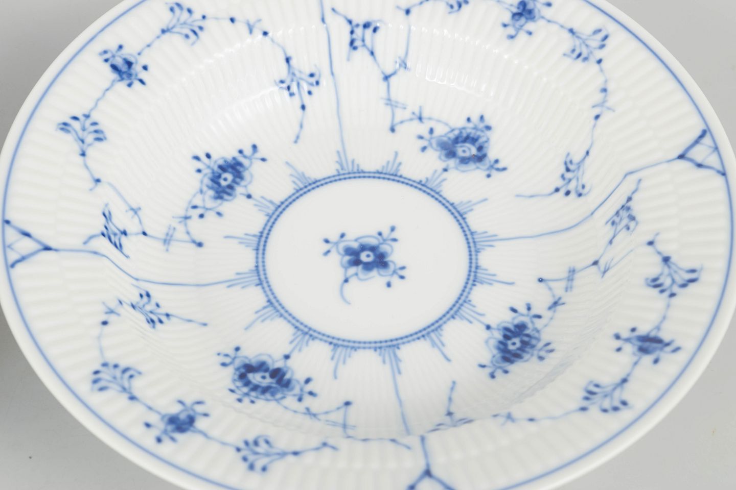 Royal Copenhagen Musselmalet Riflet, sæt af tre pasta-tallerkener.Sæt af tre håndmalede porcelænstallerkener dekoreret med det klassiske musselmalede riflet mønster i blå underglasur. Tallerkenerne har bred fane med riflede detaljer og centralt blomsterornament omgivet af slyngede blomstergrene. Undersiden er fabriksstemplet Royal Copenhagen. To tallerkener i første sortering og én annulleret med én indridset streg gennem fabriksstemplet. Model 1/168.