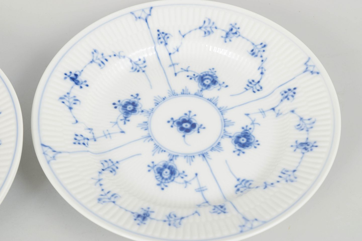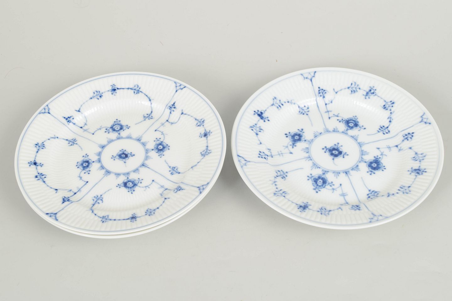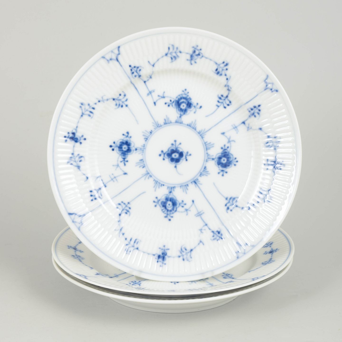 Royal Copenhagen Musselmalet Riflet, sæt af tre tallerkener.Sæt af tre håndmalede porcelænstallerkener dekoreret med det klassiske musselmalede riflet mønster i blå underglasur. Tallerkenerne har riflet fane og centralt blomsterornament omgivet af slyngede blomstergrene, et karakteristisk træk ved serien. Undersiden er fabriksstemplet Royal Copenhagen, første sortering. Model 1/179.