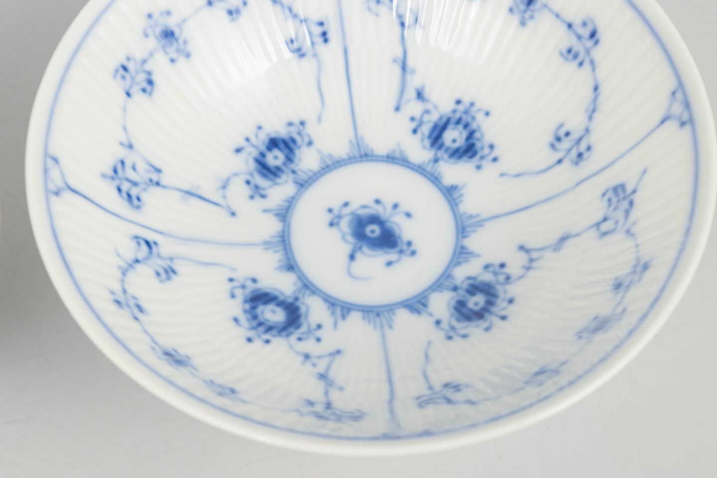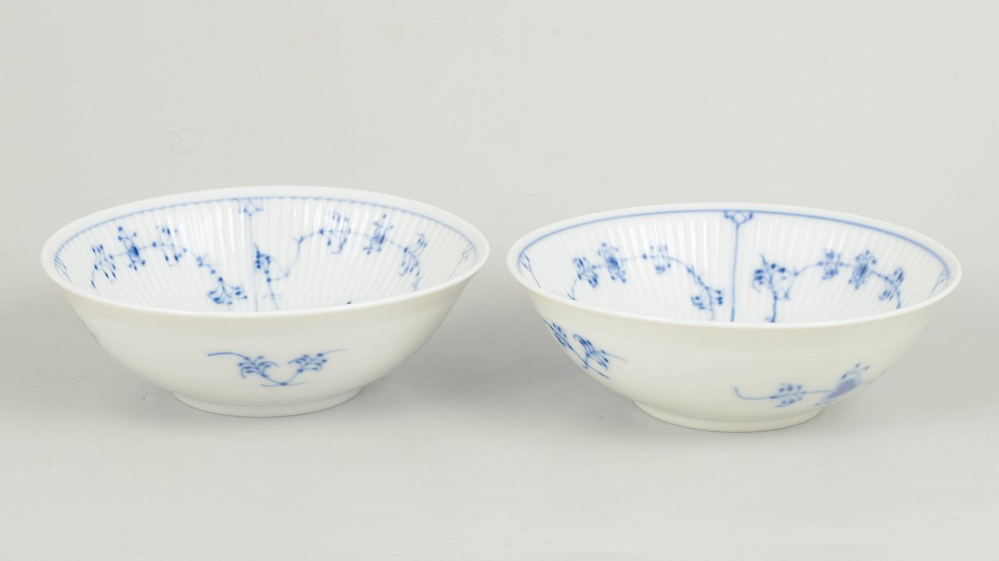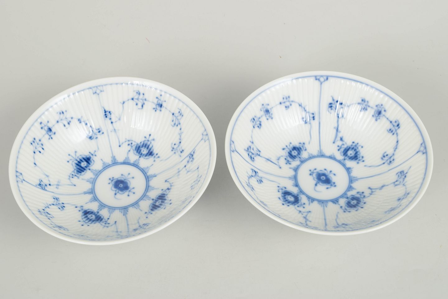 Royal Copenhagen Musselmalet Riflet, sæt af to skåle.Sæt af to håndmalede porcelænsskåle dekoreret med det klassiske musselmalede riflet mønster i blå underglasur. Skålene har elegant riflet form med svagt udadbøjet rand. Undersiden er fabriksstemplet Royal Copenhagen, første sortering. Model 1/290.