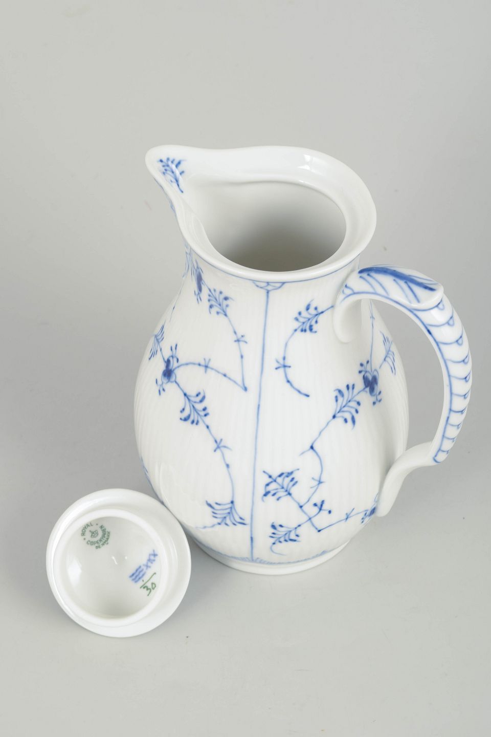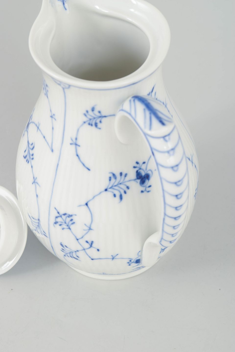 Royal Copenhagen Musselmalet Riflet, sjælden chokoladekande med låg.Sjælden håndmalet chokoladekande i porcelæn dekoreret med det klassiske musselmalede riflet mønster i blå underglasur. Formen har en elegant høj korpus med buet tud, svungen hank og kuppelformet låg med knop. Undersiden er fabriksstemplet Royal Copenhagen, første sortering. Model 1/30.