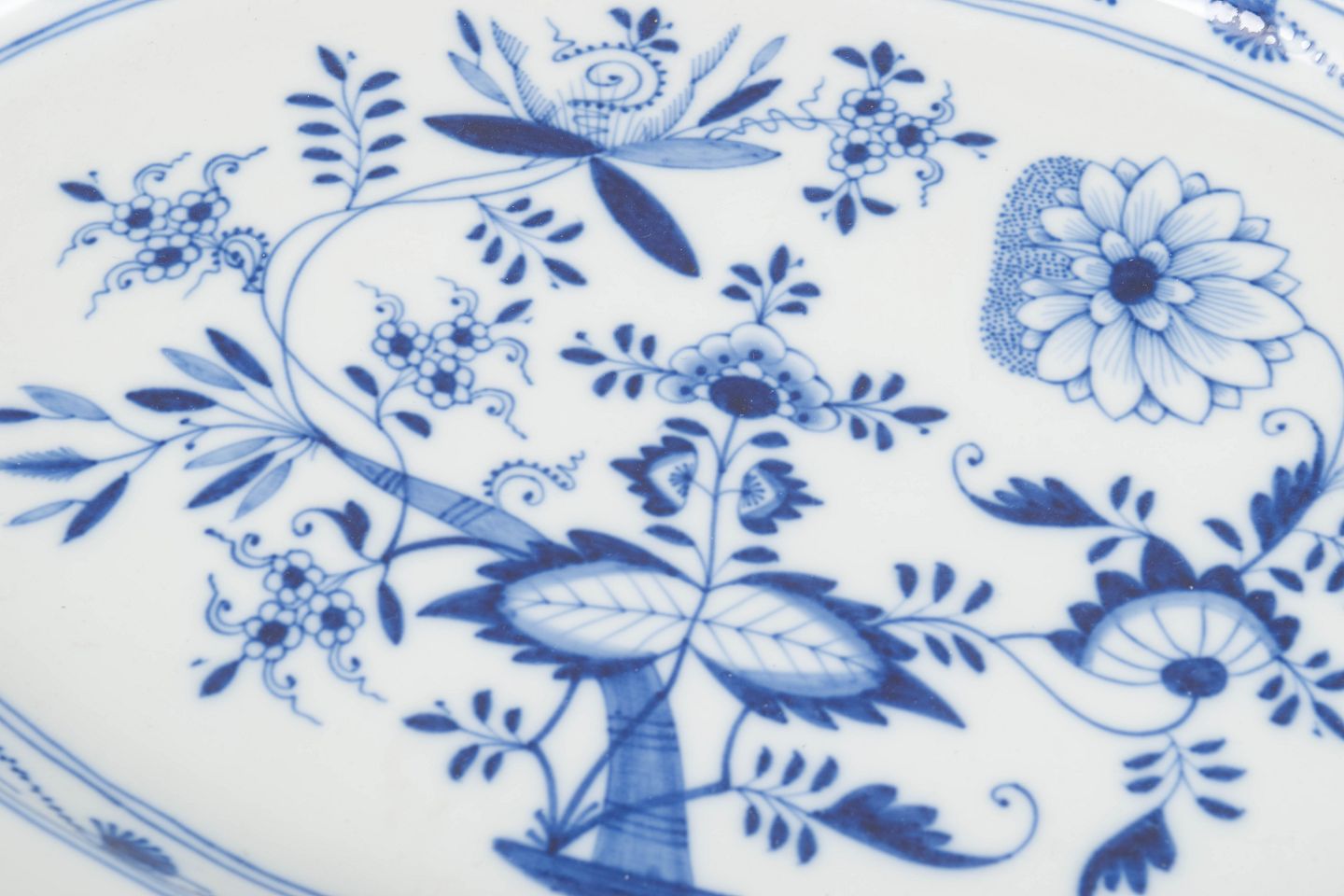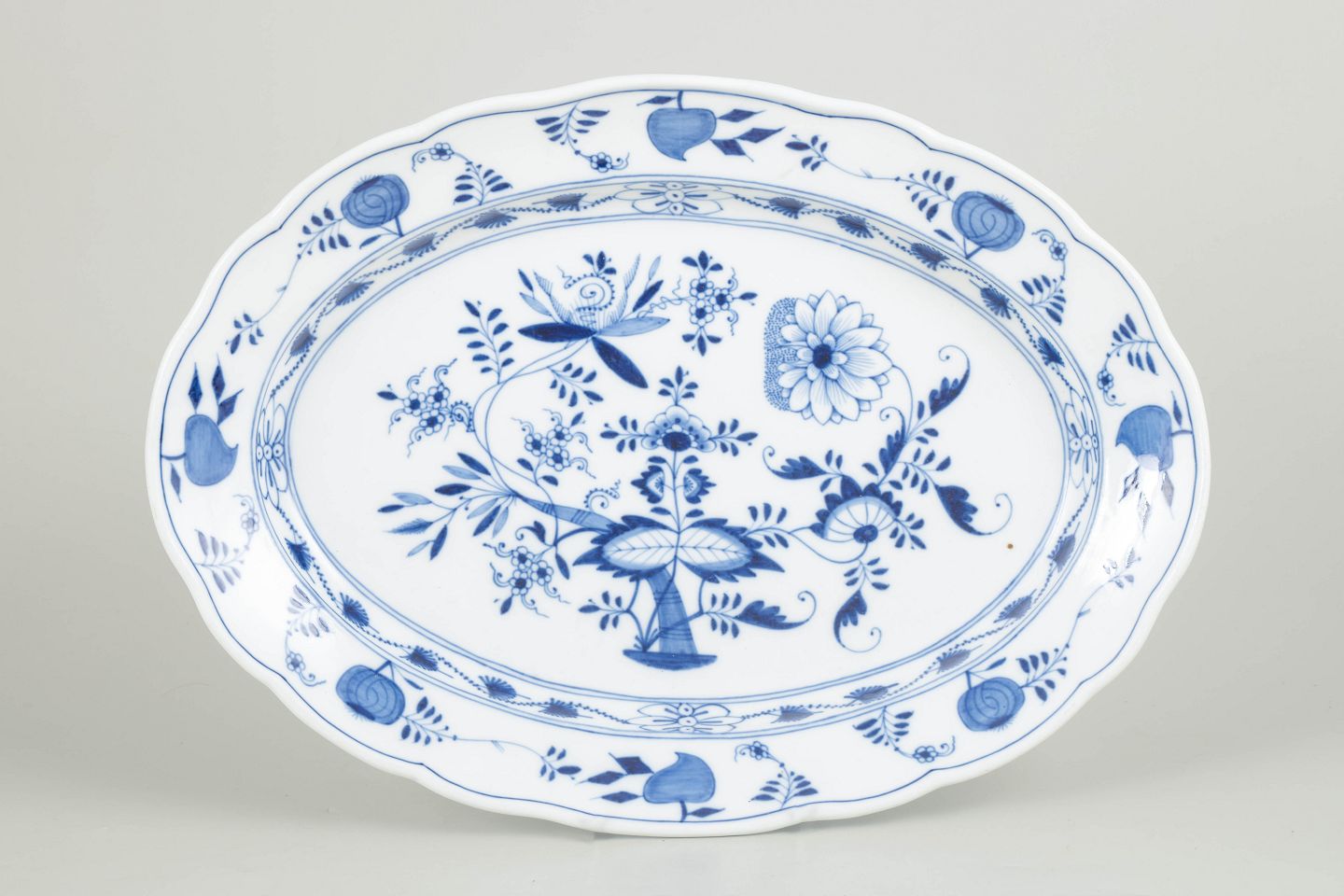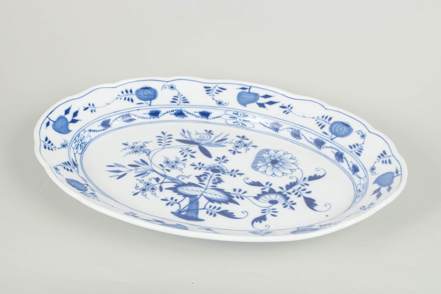 Meissen løgmønster stort ovalt serveringsfad.Stort ovalt serveringsfad i porcelæn dekoreret med det klassiske håndmalede løgmønster i koboltblå underglasur. Formen har en elegant svungen fane med kontureret rand og en central blomsteropsats omgivet af stiliserede blomster- og frugtmotiver. Modellen blev fremstillet hos Meissen i begyndelsen af 1900-tallet og er mærket på undersiden med de karakteristiske krydsede sværd, annulleret med to indridsede streger.
