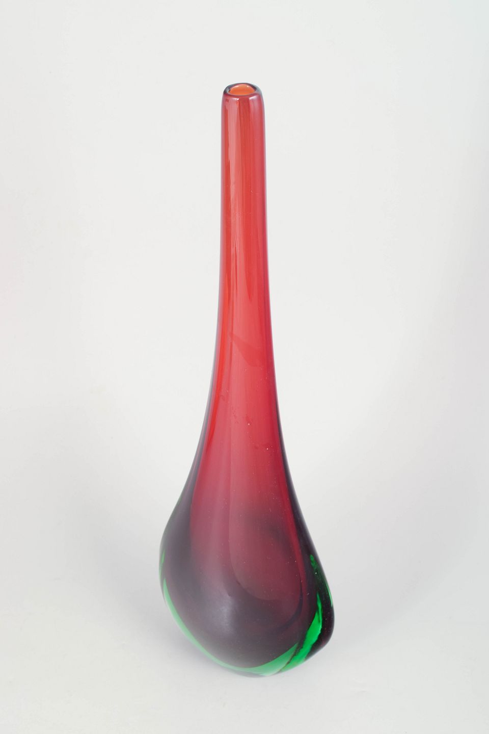 Murano, gulvvase.Elegant kunstglasvase i klart glas med indkapslet rød kerne og grøn tone i bunden samt meget lang slank hals, udført i karakteristisk Murano-stil med skulpturel dråbeform.