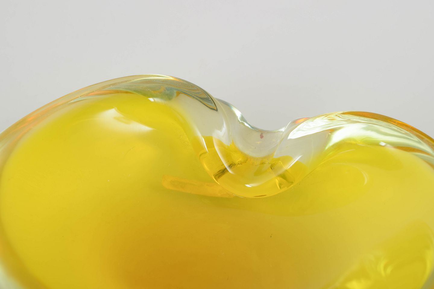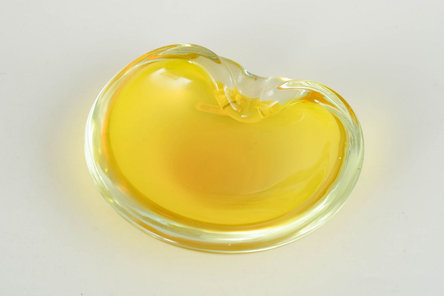 Murano, skål.Organisk formet kunstglasskål i gult glas med klar rand og blødt bølgende form. Original mærkat “Murano Glass – Made in Italy”.