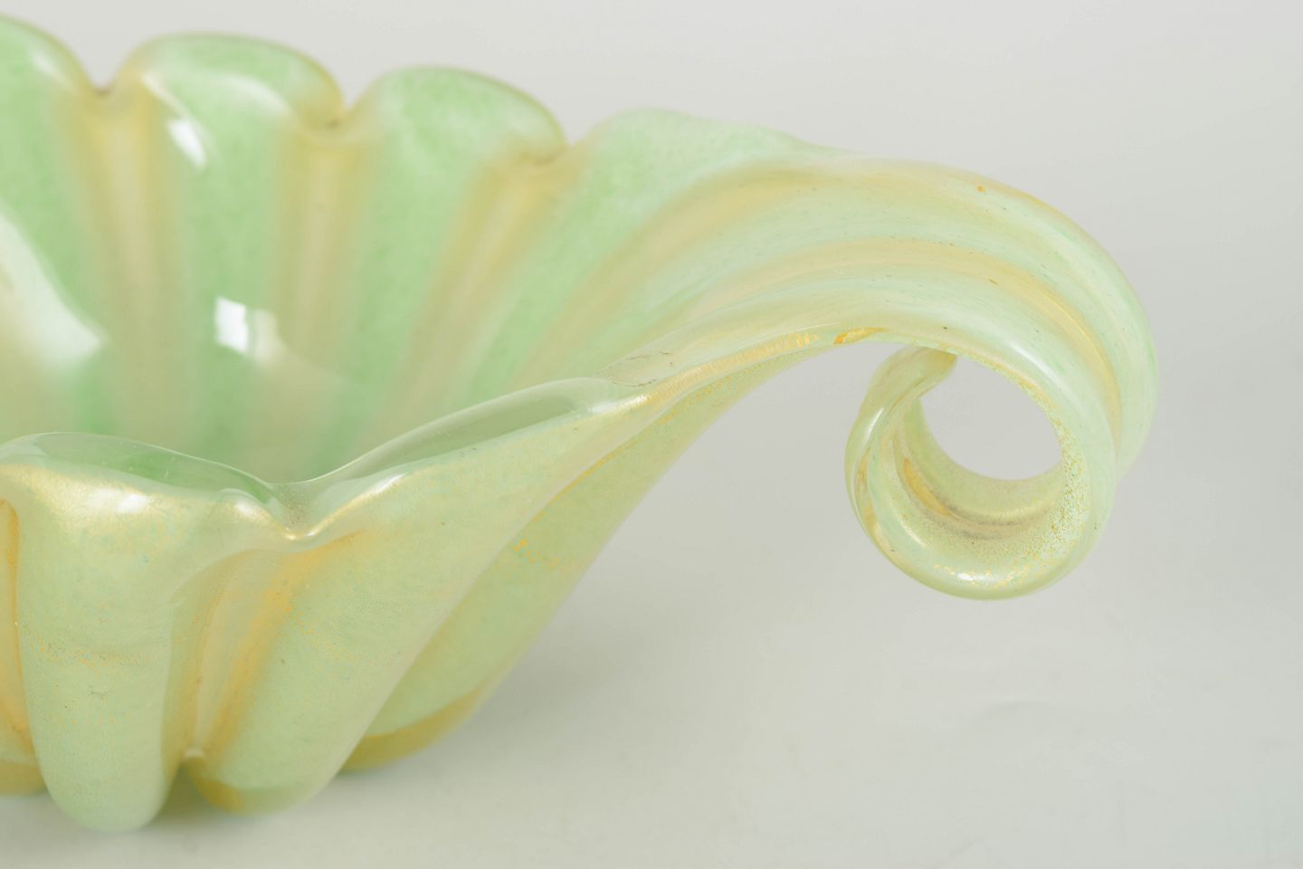 Murano, skål.Dekorativ kunstglasskål i iriserende glas med bølgende korpus og elegante opadbøjede ender, udført i karakteristisk Murano-stil med bløde former og lysreflekterende overflade.
