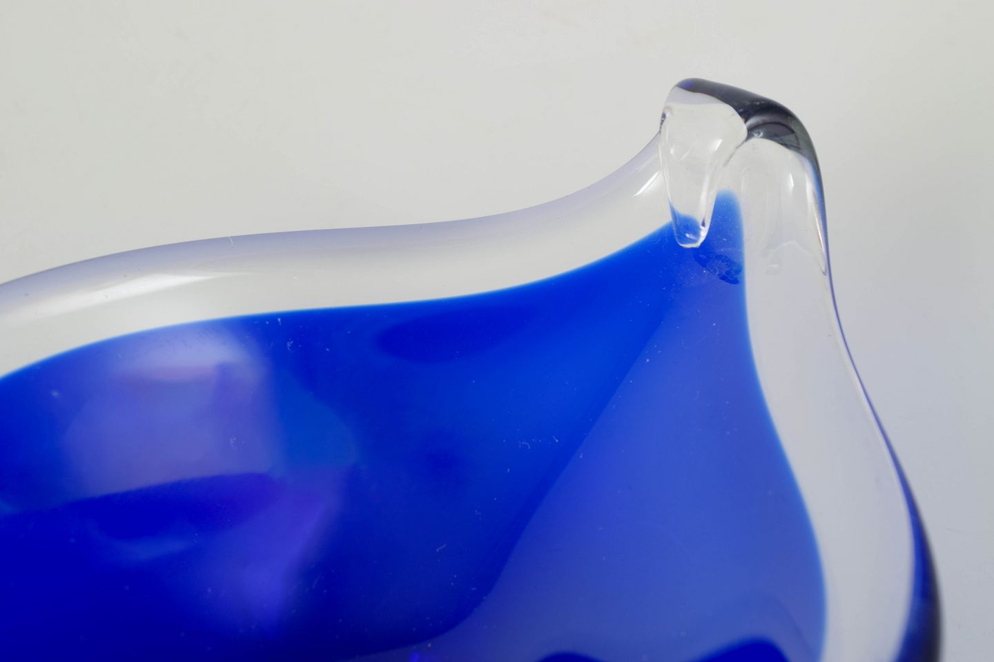 Murano, skål.Organisk formet glasskål i blåt glas med klar kant og elegant bølgende rand, udført i klassisk italiensk kunstglas fra Murano.