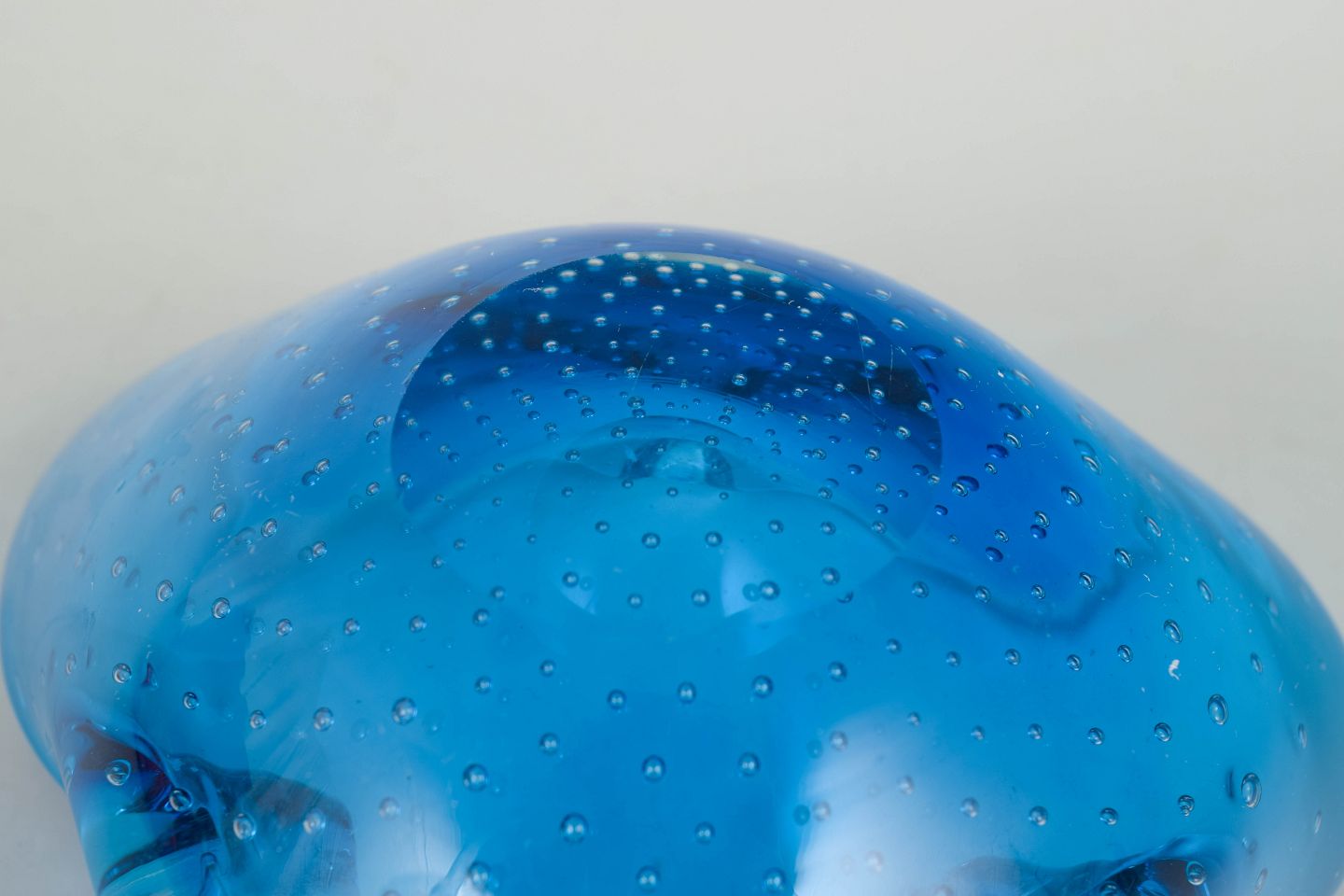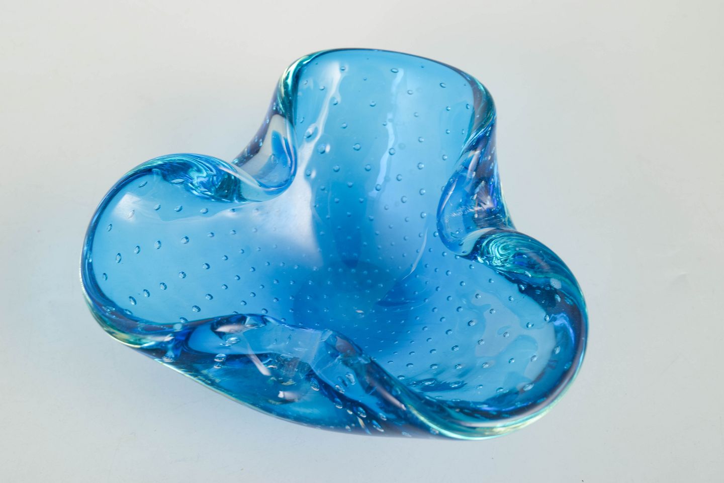 Murano, skål.Organisk formet glasskål i klart blåt glas med indkapslede luftbobler og blødt bølgende rand, udført i den karakteristiske italienske kunstglasstil fra Murano.