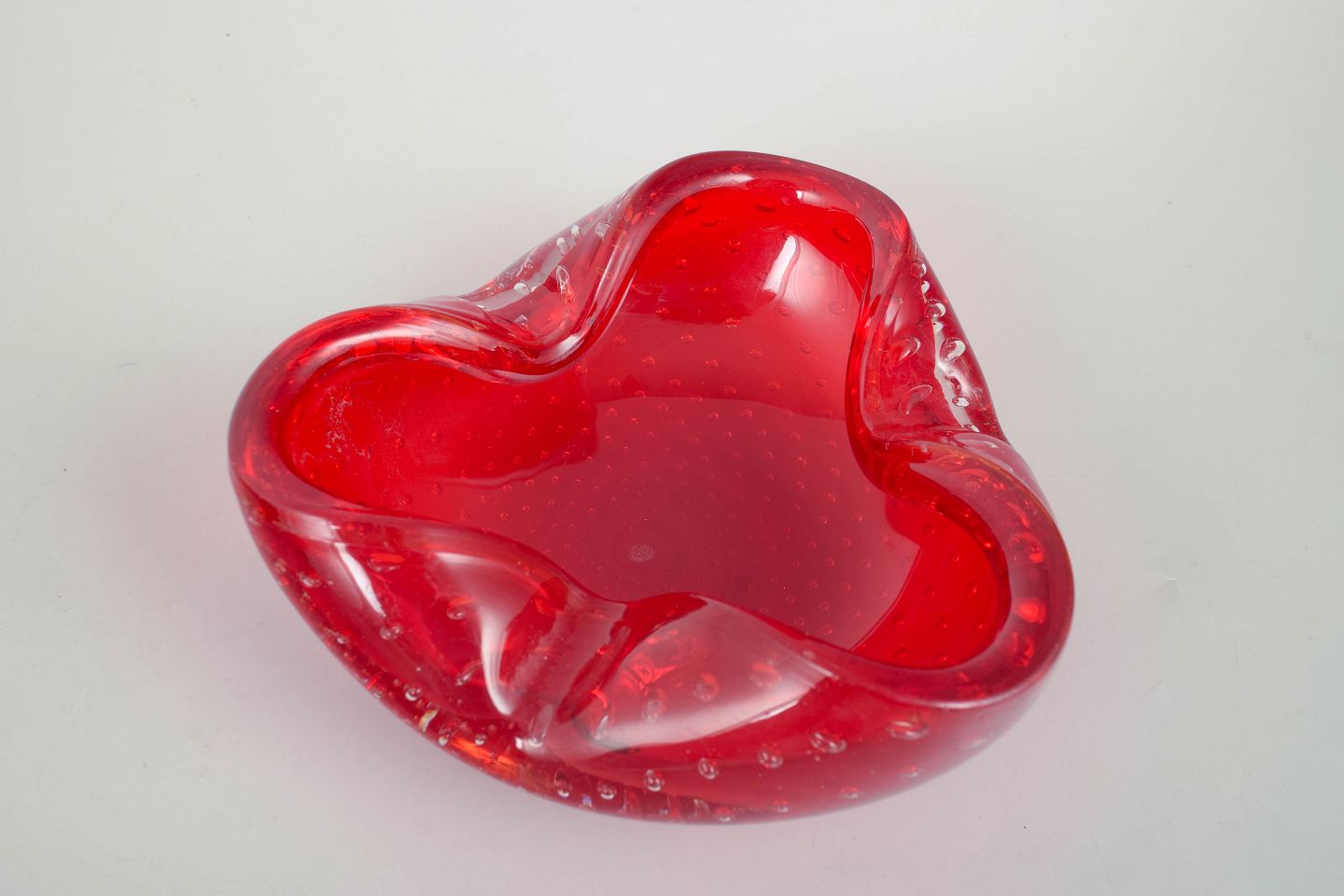 Murano, skål.Organisk formet glasskål i kraftigt rødt glas med indkapslede luftbobler og blødt bølgende rand, udført i den karakteristiske italienske kunstglasstil fra Murano.