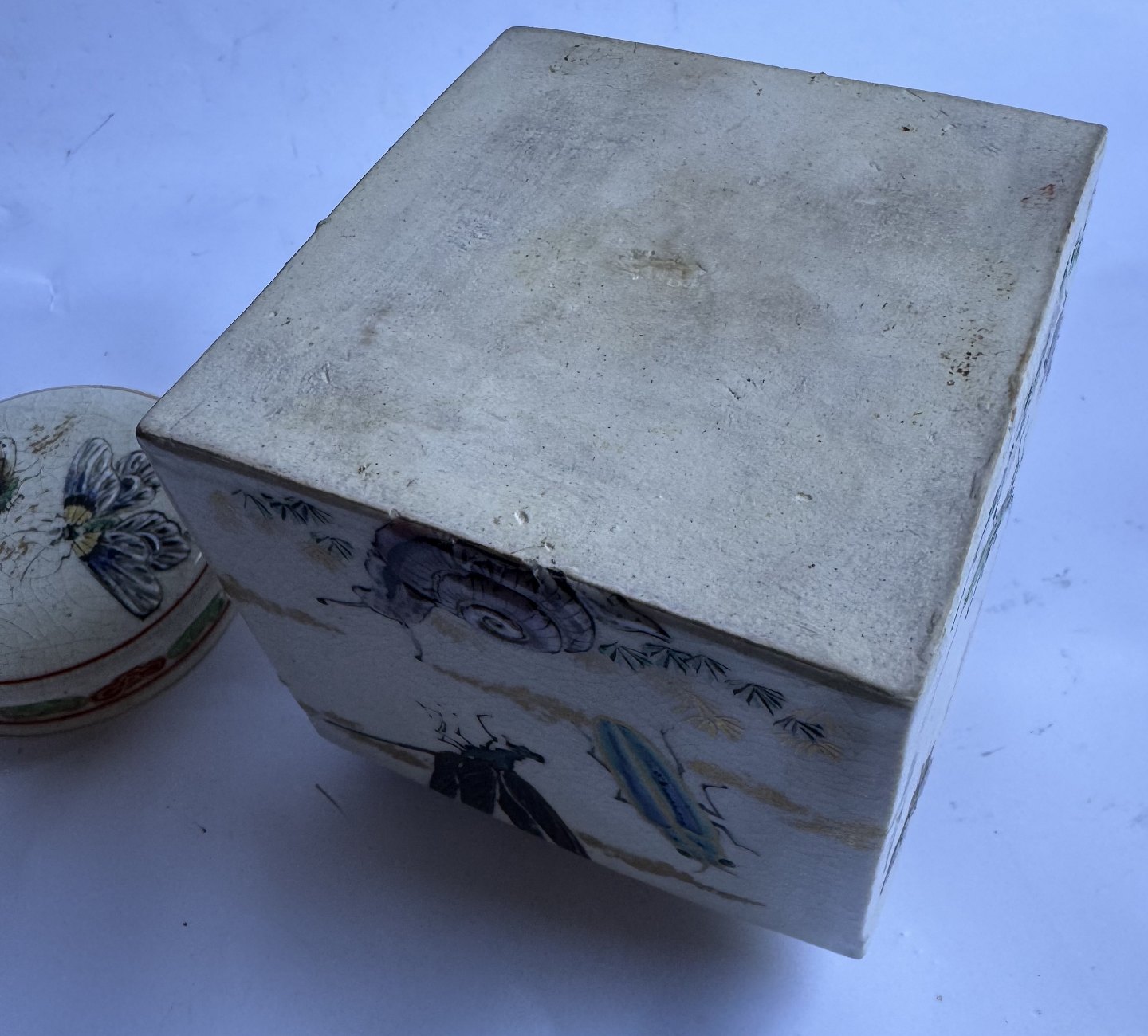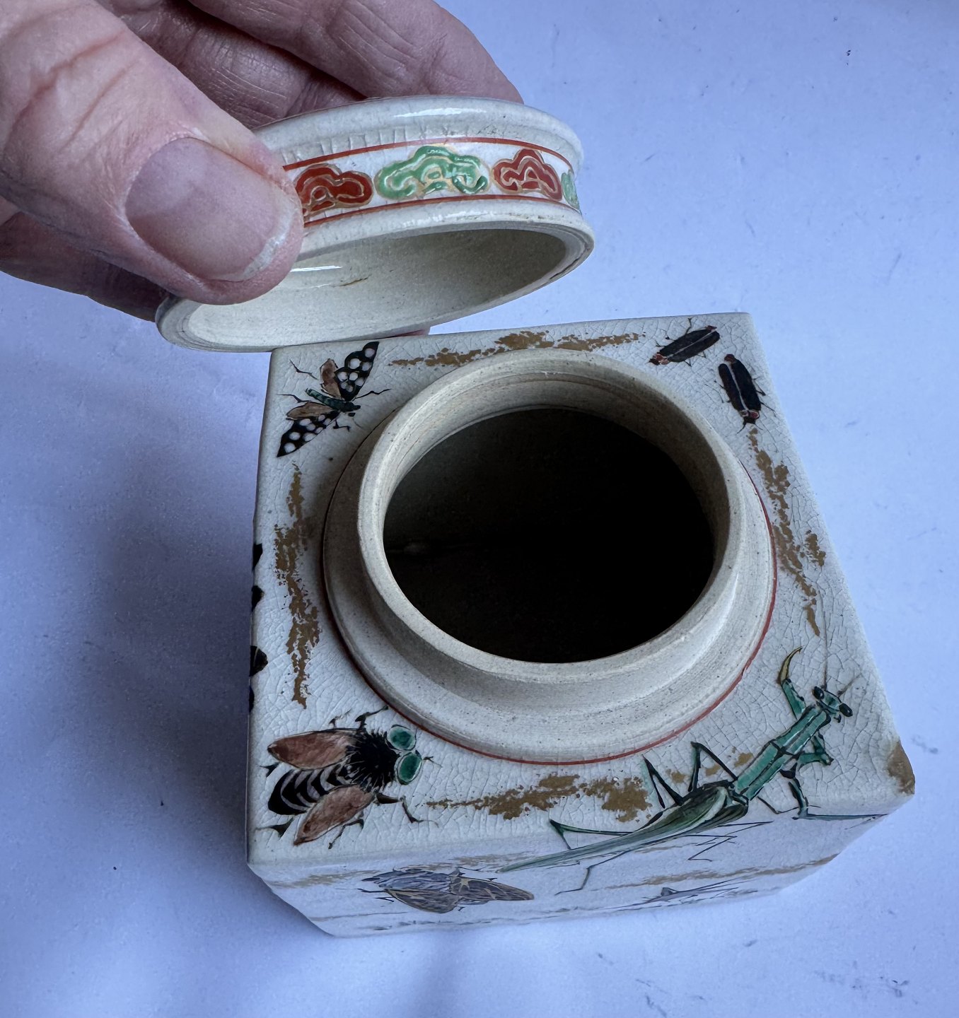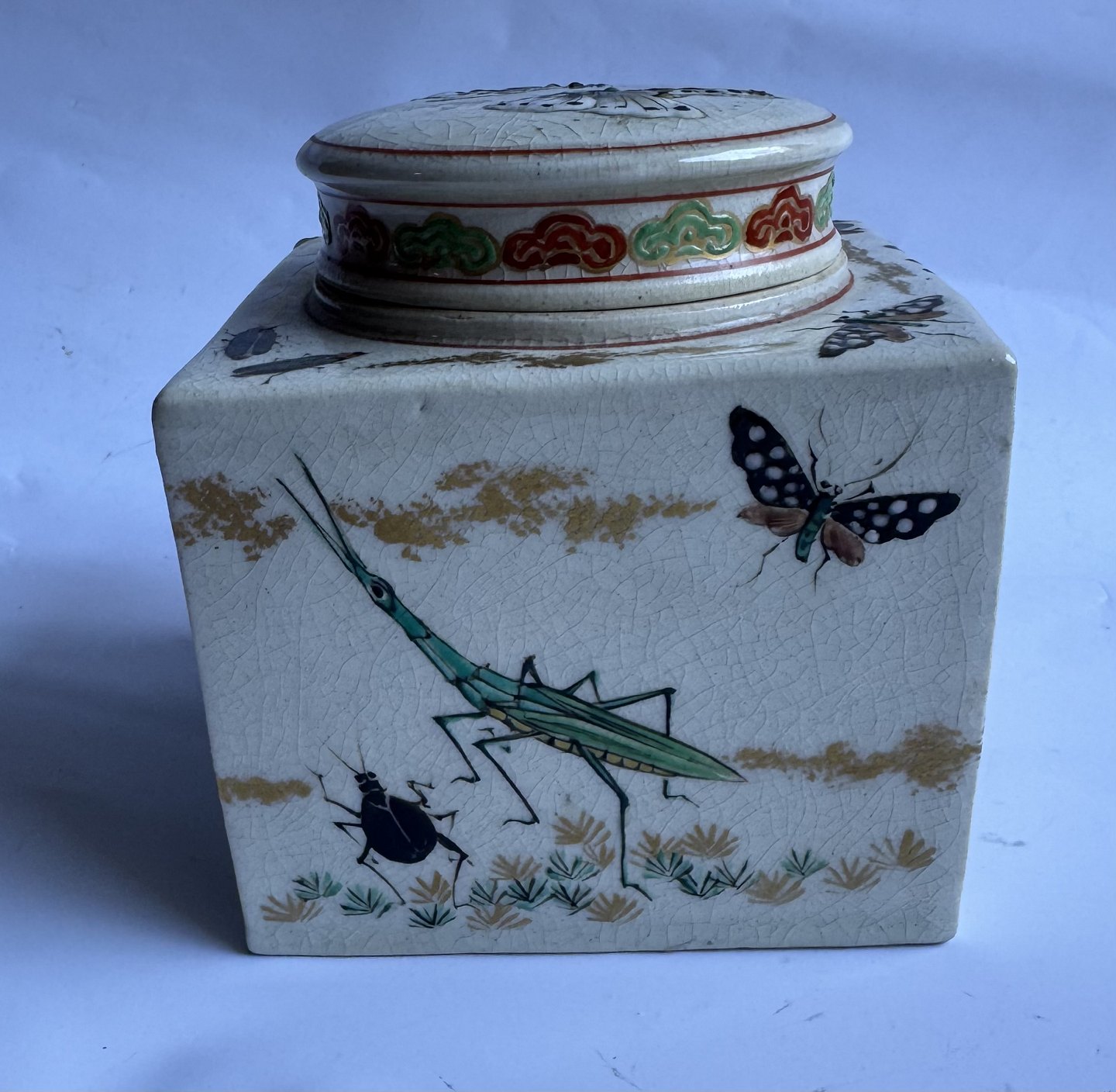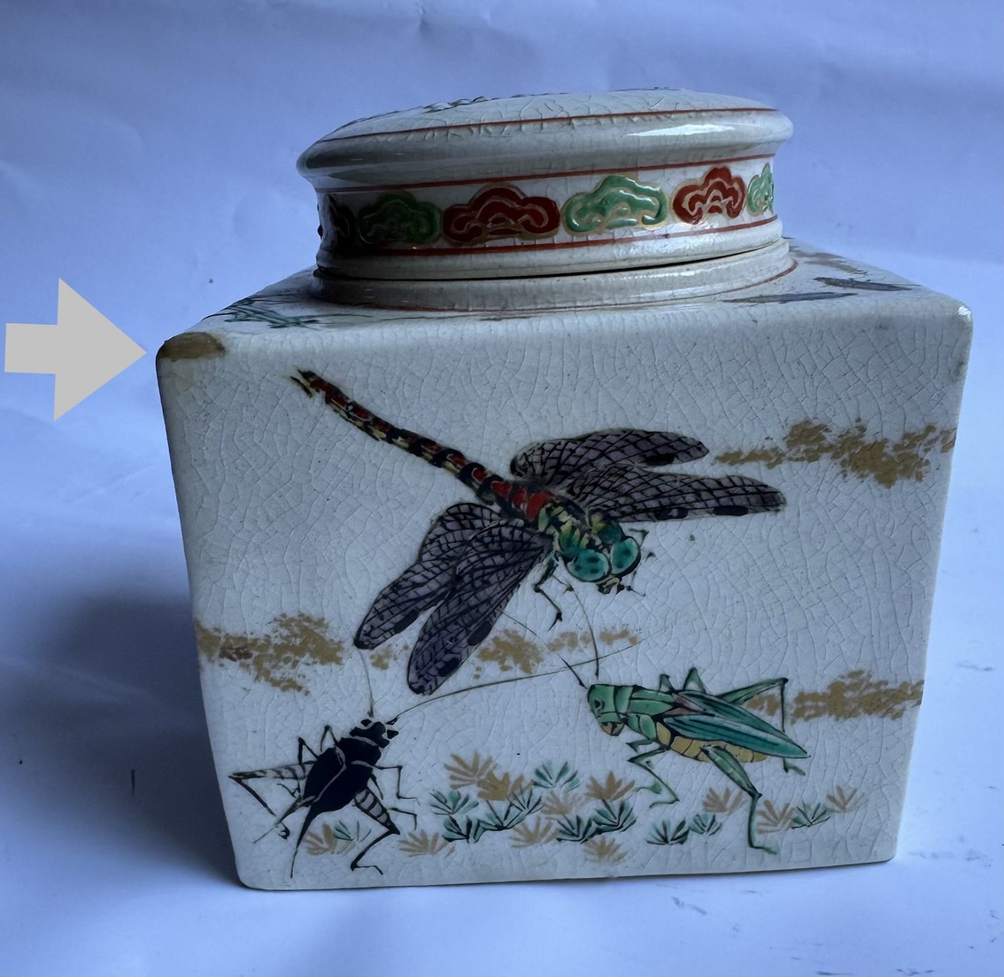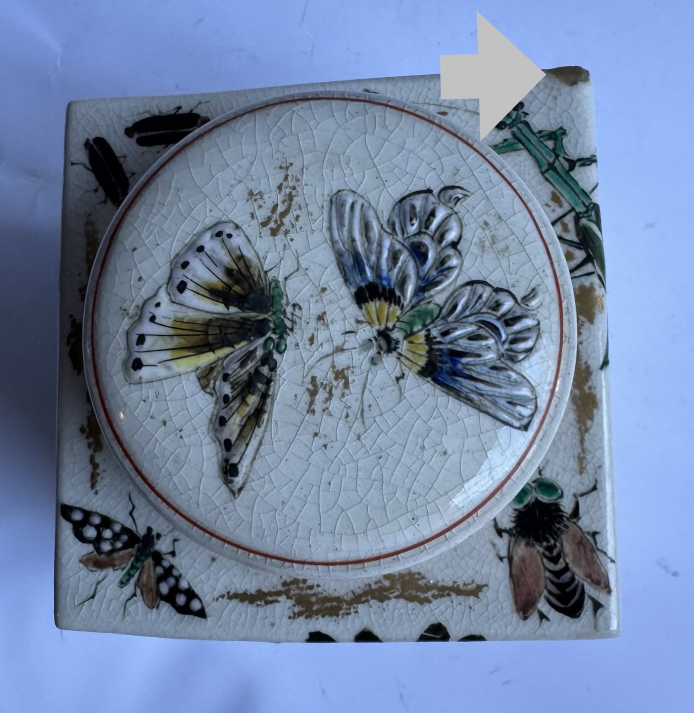 Firkantet tedåse i fajance fra Japan produceret omkring 1910. Smukt dekoreret med insekter i emalje, bl.a. sommerfugle og guldsmed, på alle sider samt på låget. Ubekendt fabriksmærke indstemplet på bunden. Ud over et lille skrab på et hjørne (følg de grå pile) er der intet at bemærke. Mål: H. 10,7 cm samt 9,5 x 9,5 cm.v/ Jesper Reutemann