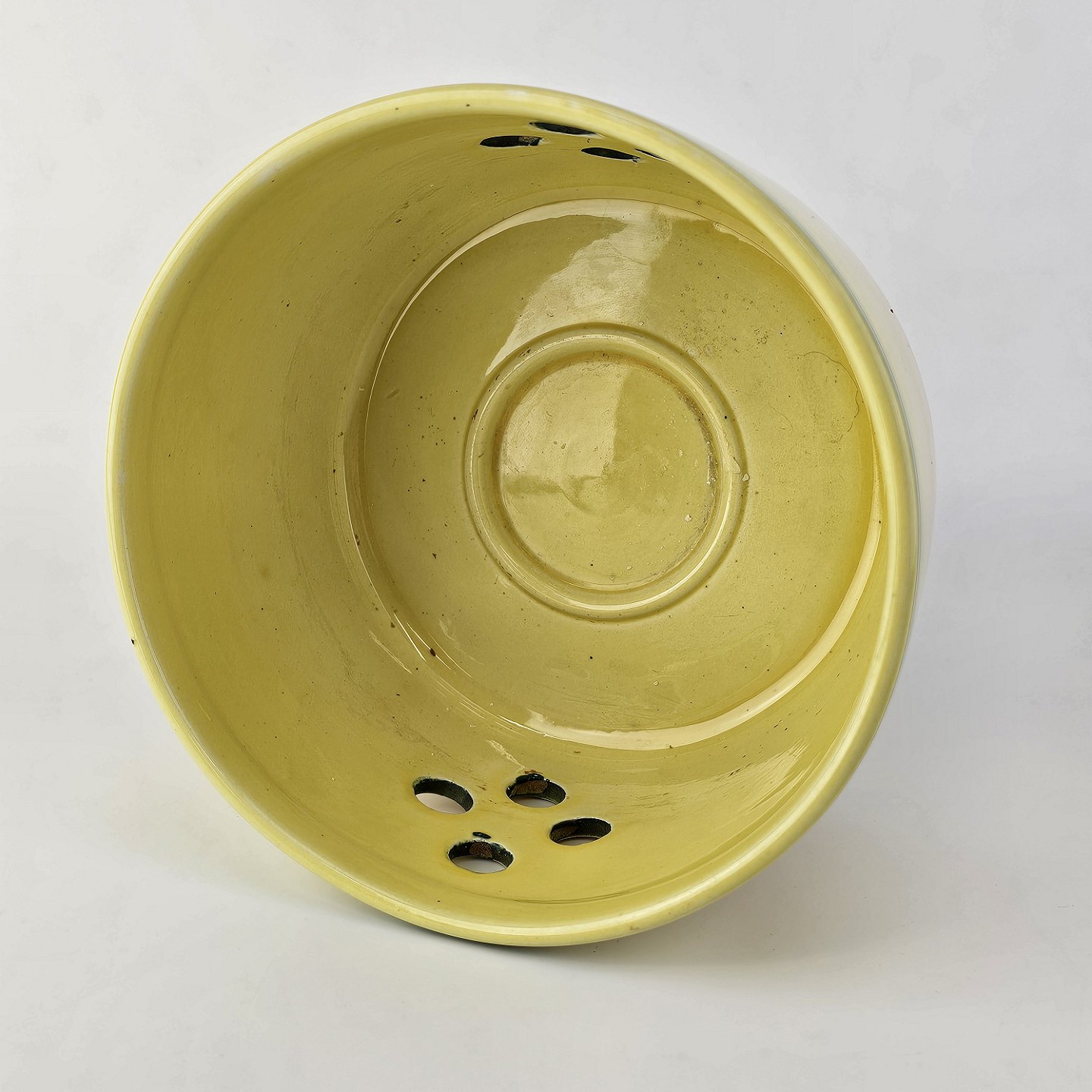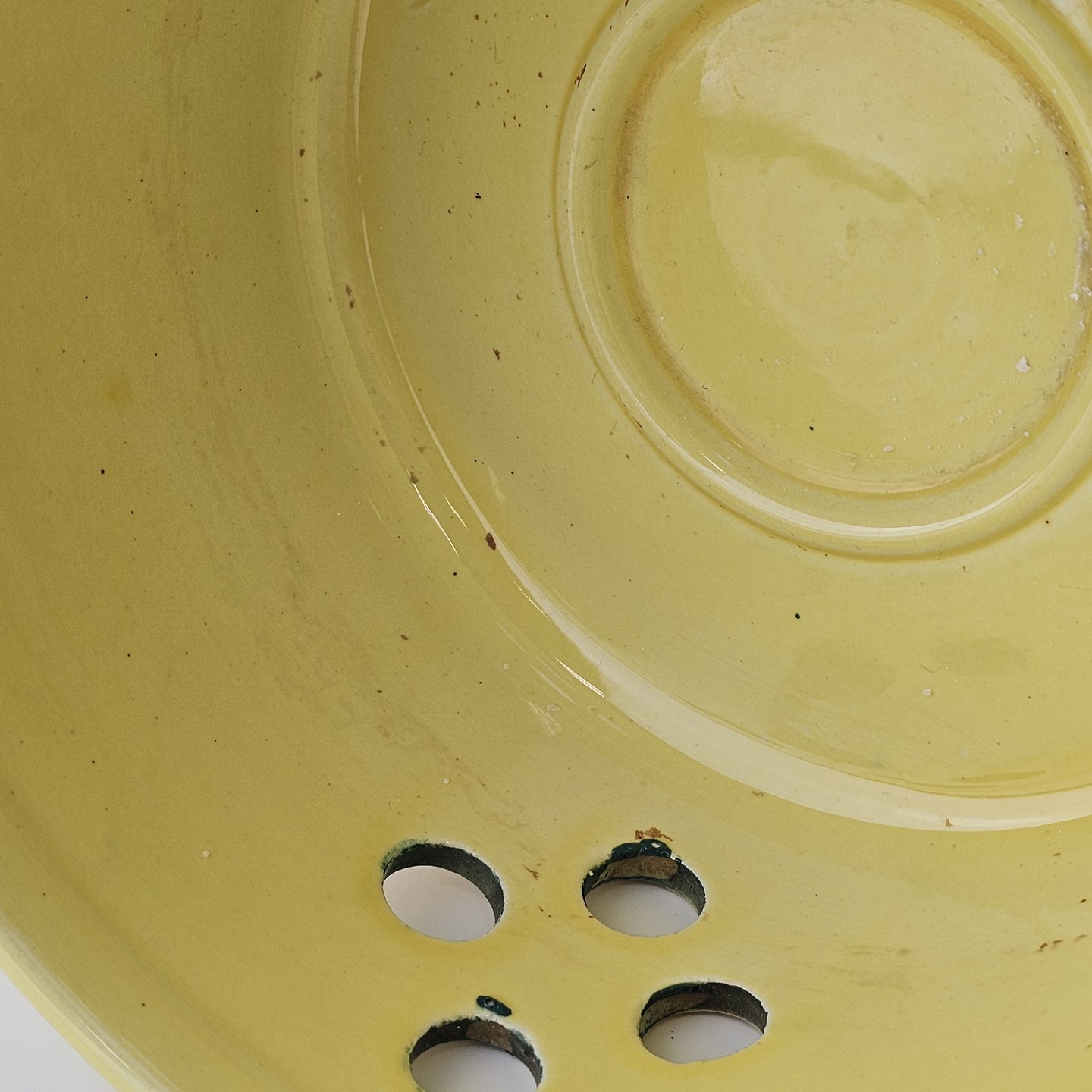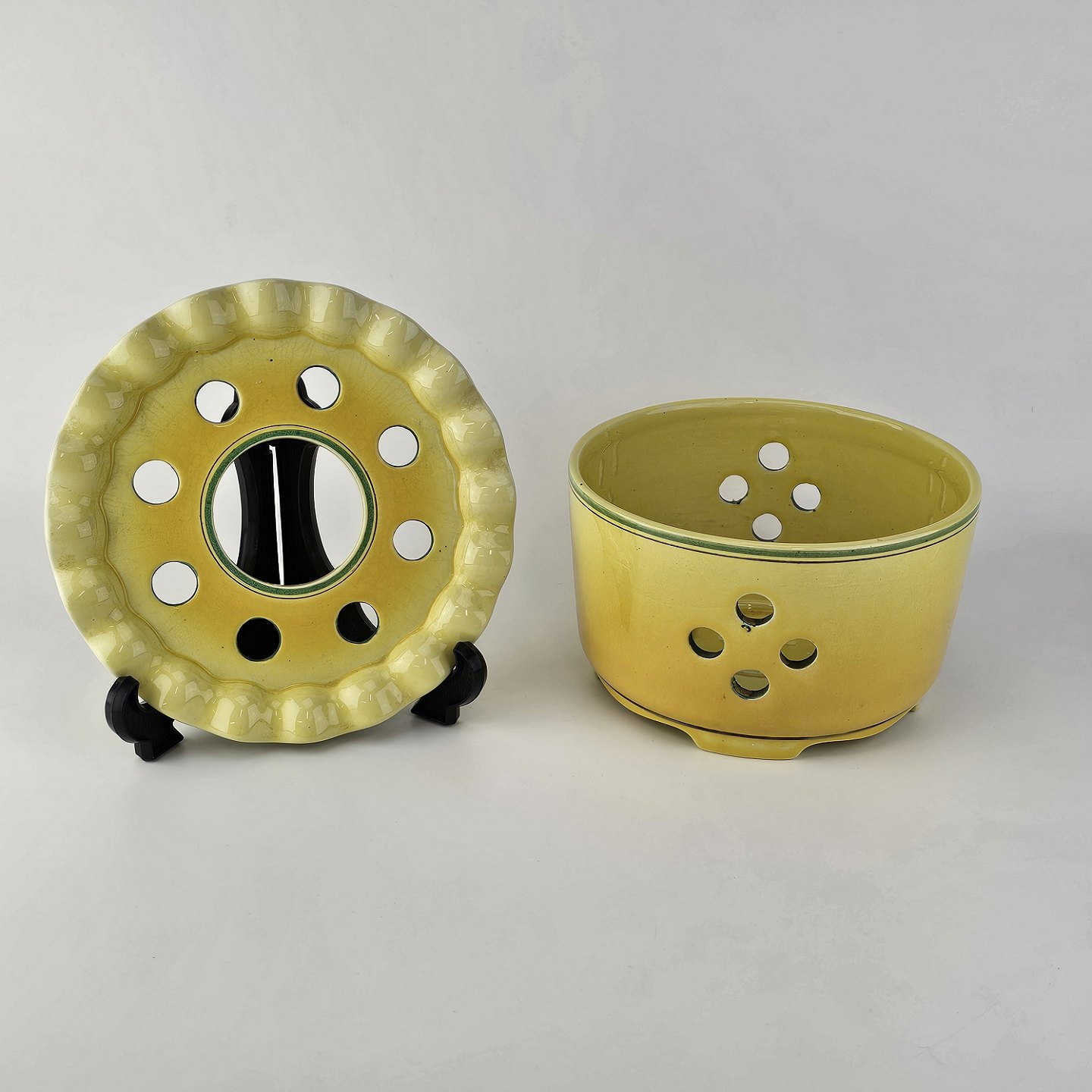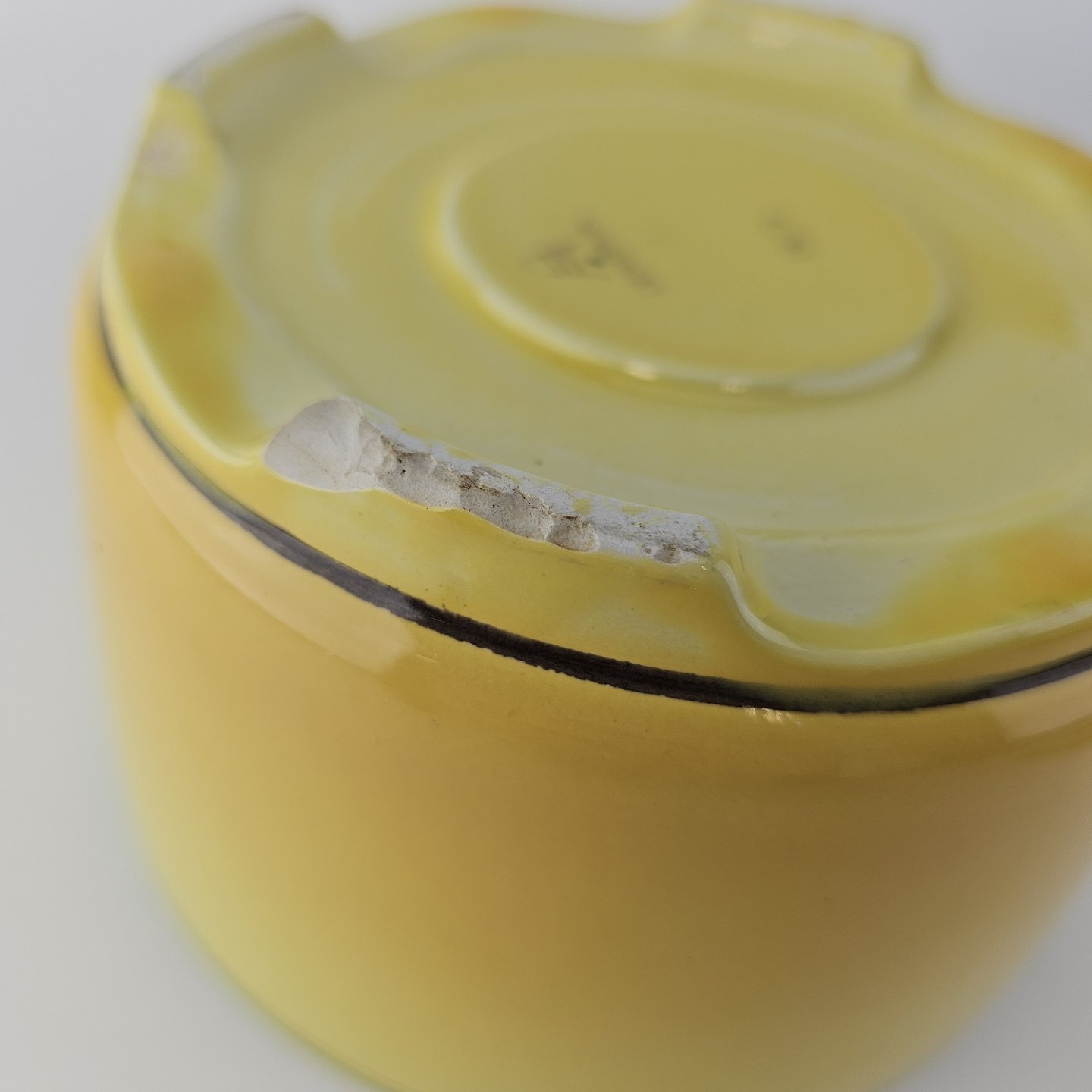 Fajancestel i stelform C med dekoration i gule nuancer med grøn stribe.