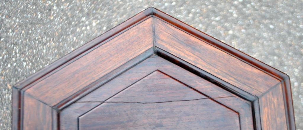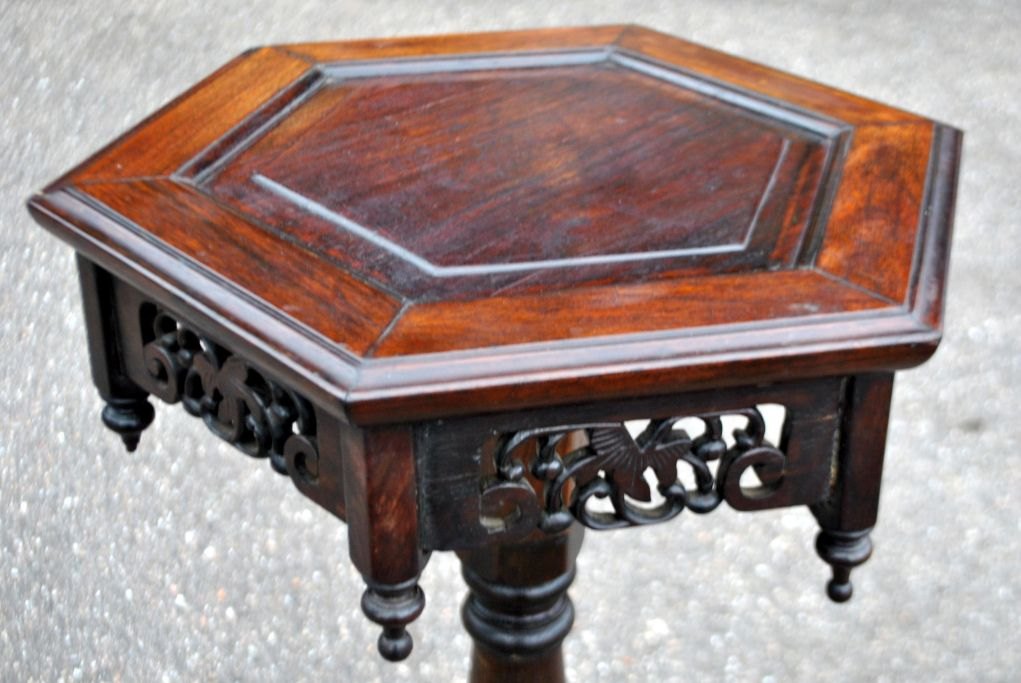 Sekskantet sidebord, 19. årh. Kina. Mahogni. På tre ben med udskæringer. H: 58,5 cm. B: 39 cm.Emne nummer: 29077