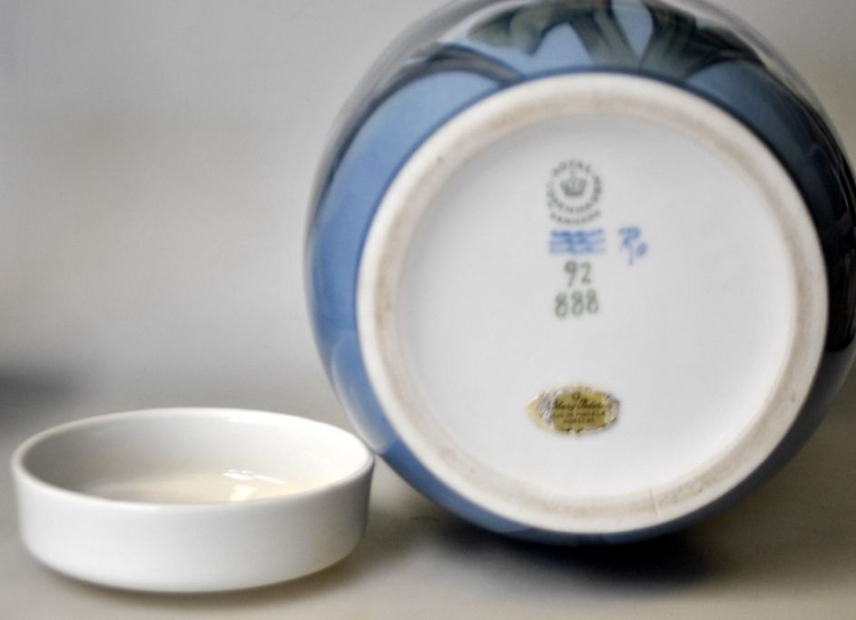 Lågkrukke i porcelæn, Royal Copenhagen no. 92/888, 20. årh. København, Danmark. Dekoreret med pæoner. Stemplet. H: 25 cm. Dia: 17 cm.1. Sortering.