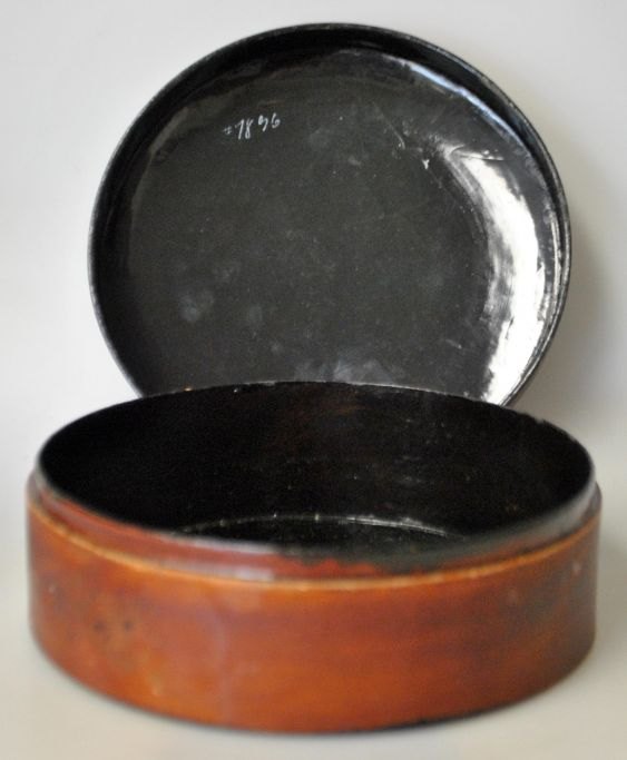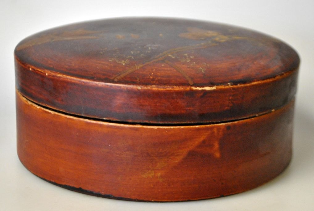 Kinesisk trææske med guldbemaling, 19. årh. Dekoreret med fugle og landskab. H: 7 cm. Dia: 17 cm.Emne nummer: 29086