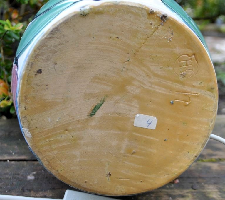 Bordlampe fra Hornbæk Keramik, 20. Årh. Danmark. Glasur i hvid, sort, grøn og rosa. Stemplet: HK. H: 58 cm. Dia: 16 cm.