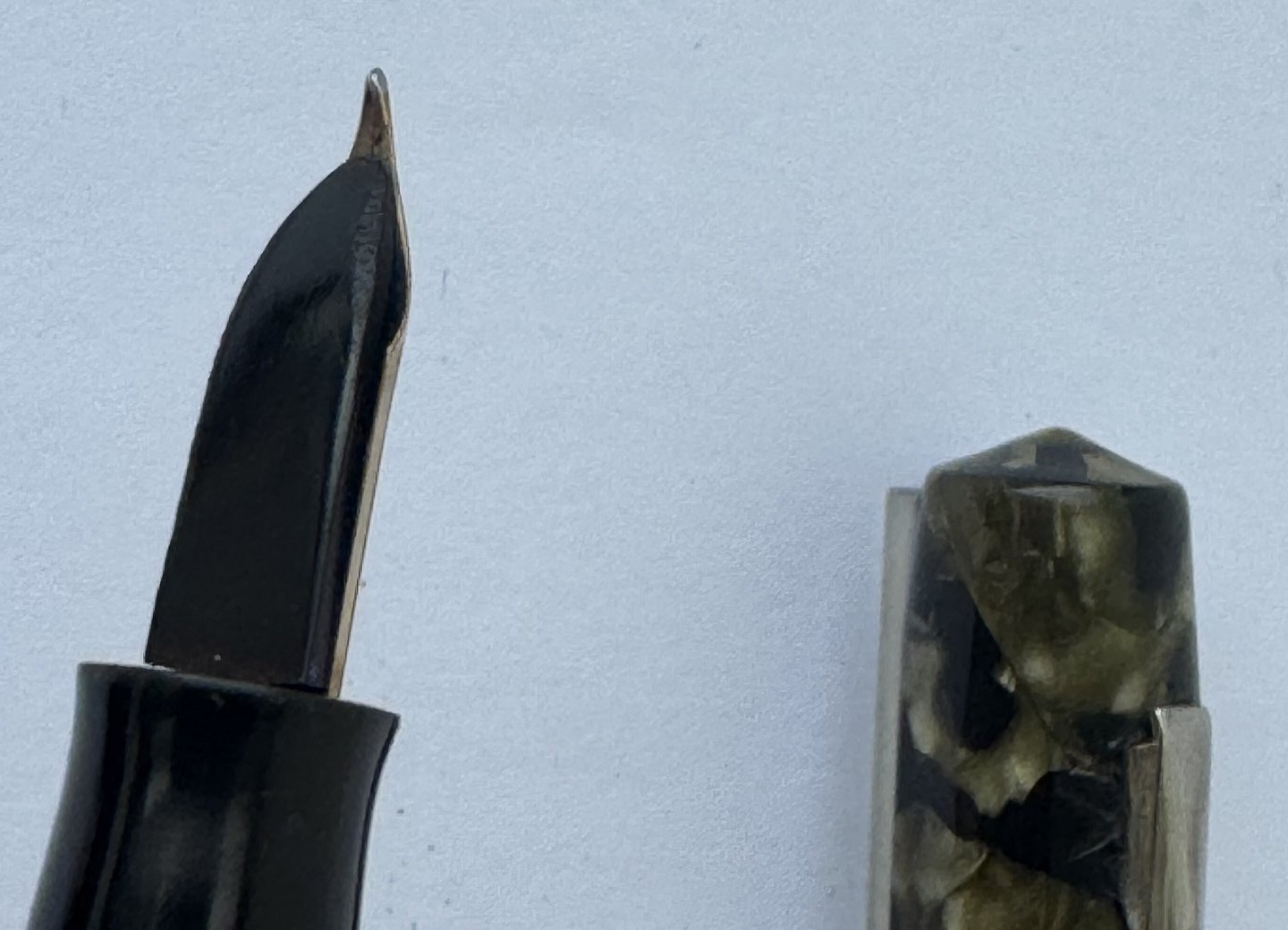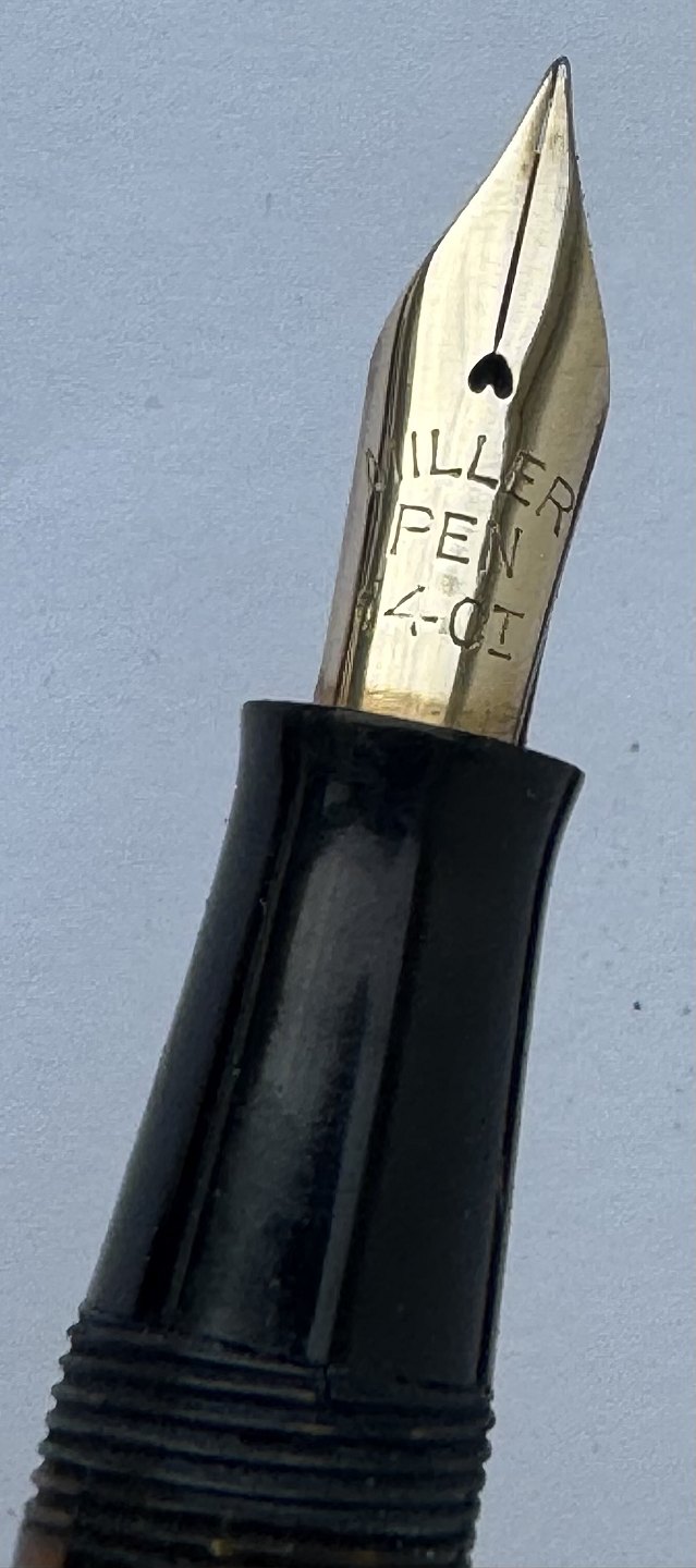REN ART DECO STIL: 10 kantet og grøn marmoreret Miller nr. 697 fyldepen fra omkring 1940. I god stand uden skader eller reparationer. Alle dele originale til denne model inklusive en 14 karats guldspids (ca. 0,30 gram). Ny gummisæk skal indsættes før den igen kan optage blæk og skrive påny. Ny gummisæk kan indsættes for et tillæg på kr. 250,00. Fyldepennen er 12,3 cm lang.v/ Jesper Reutemann