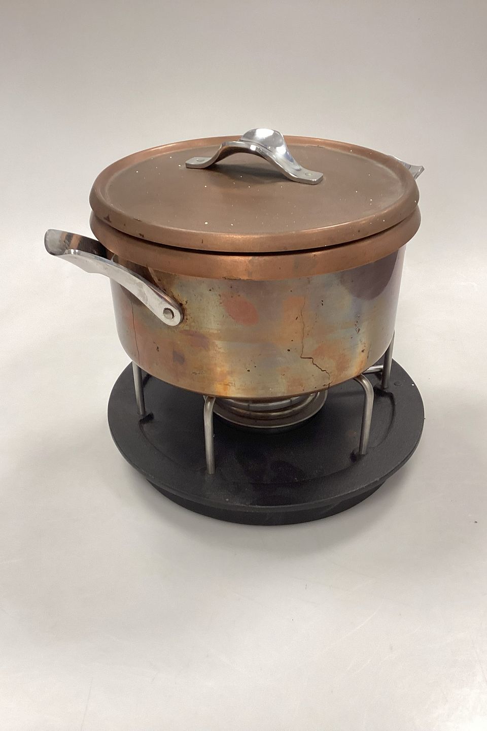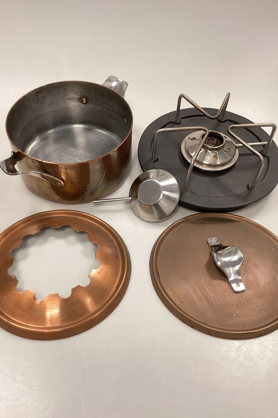 Georg Jensen fondue grydesæt i Kobber, bundfad i støbejernKomplet sæt med gryde, låg, holder, brænder og bundfad. Tydelige brugstegn, men i god stand.