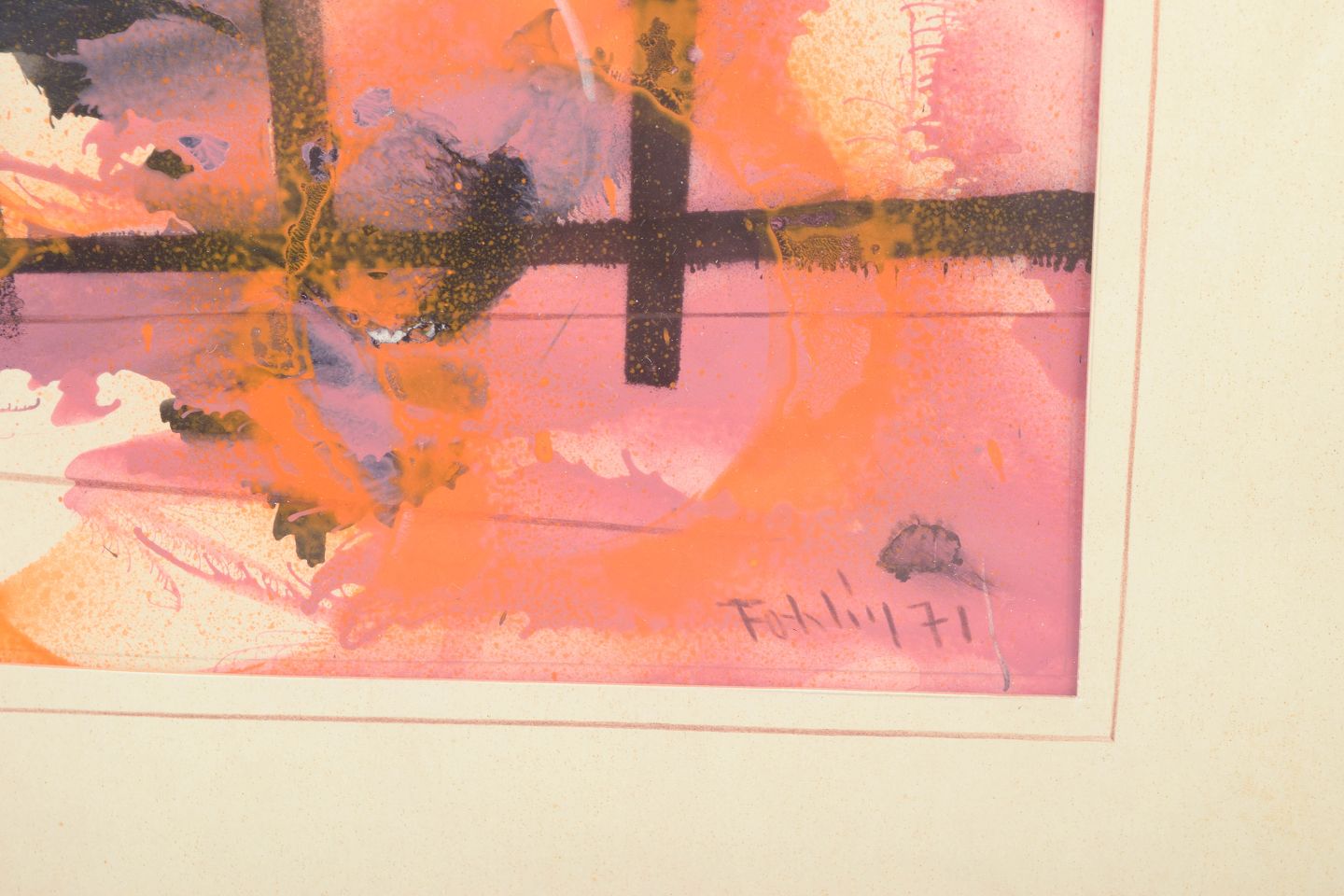Gunnar Fohlin, akvarel på papir, svensk kunstner.Abstrakt komposition udført i akvarel på papir med ekspressive farvefelter i rosa, orange, sorte og violette toner kombineret med grafiske linjer og cirkulære former. Kompositionen har en spontan og dynamisk opbygning med lagdelte strukturer og kontraster mellem transparente og mørkere farvefelter.