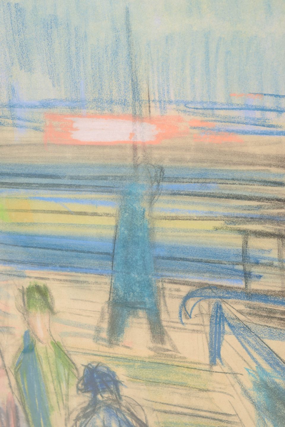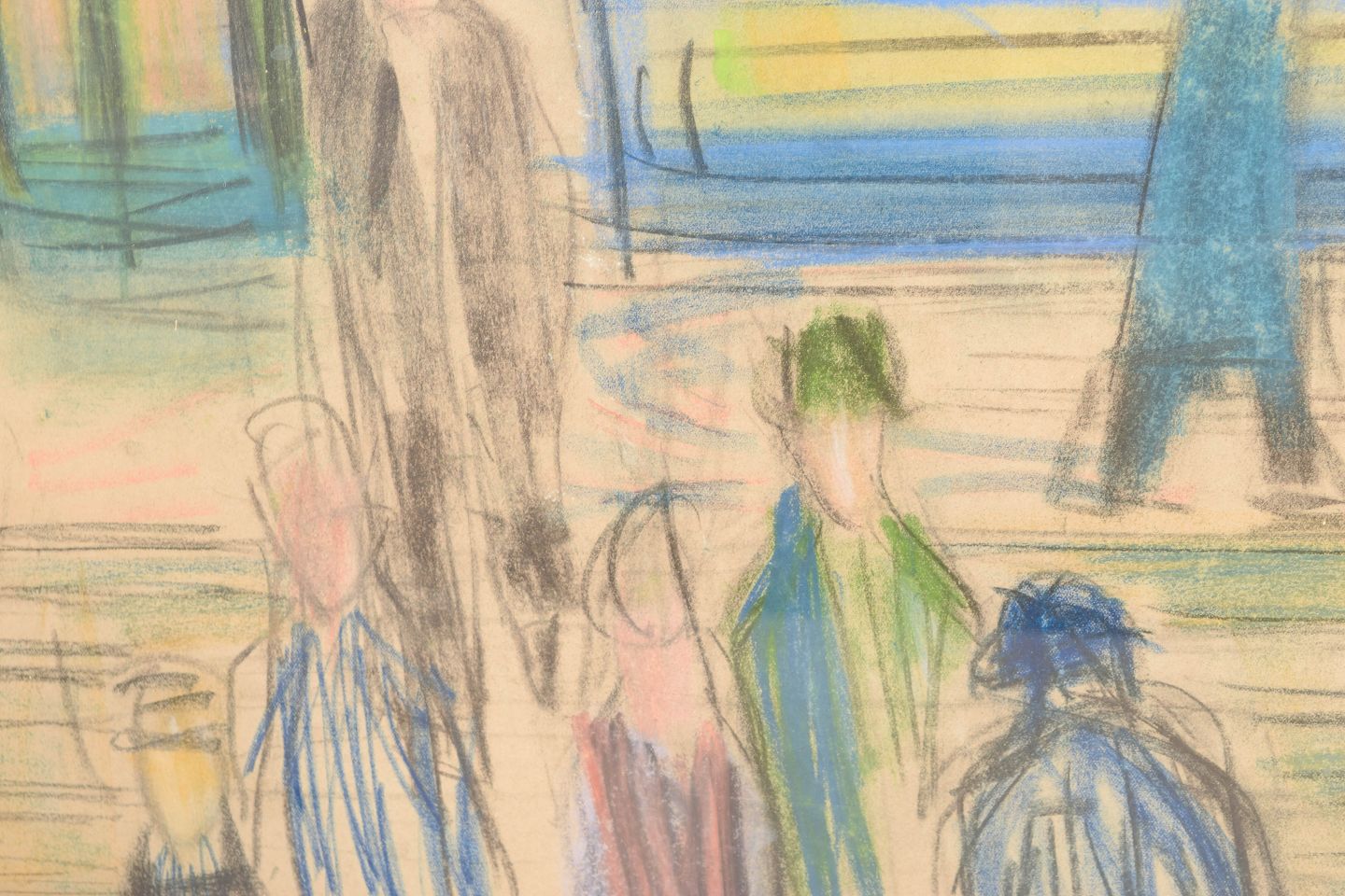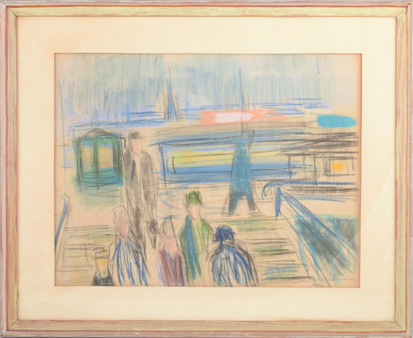Brita af Klercker, farvekridt på papir, svensk kunstner.Ekspressivt motiv med figurer og arkitektoniske elementer udført i farvekridt på papir, signeret B. Klercker nederst til højre. Kompositionen viser en stiliseret byscene med mennesker og konstruktioner gengivet i et frit, modernistisk formsprog og en let, atmosfærisk farveholdning.