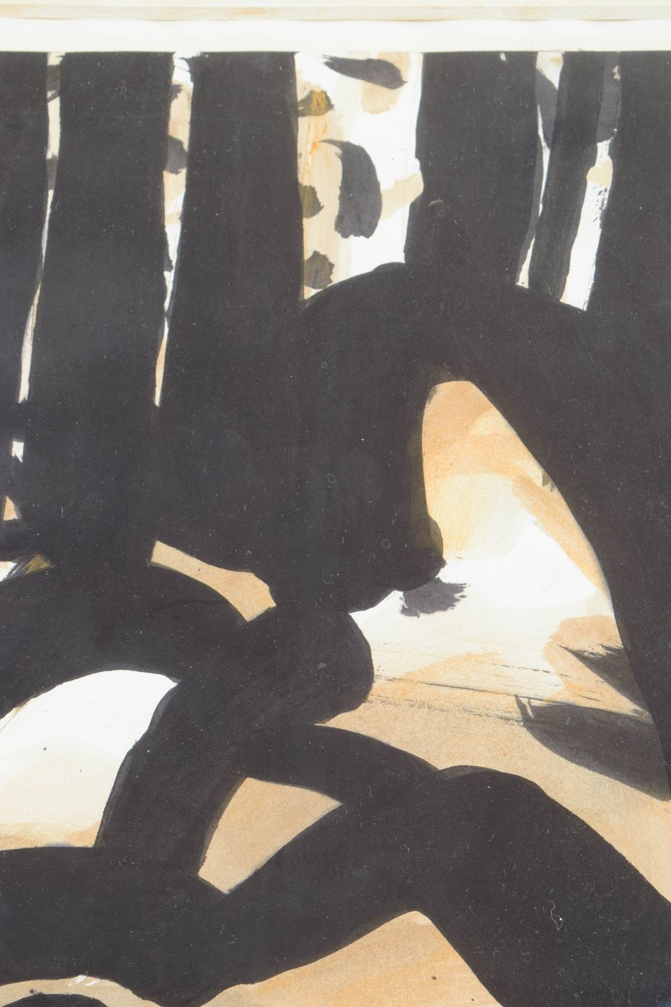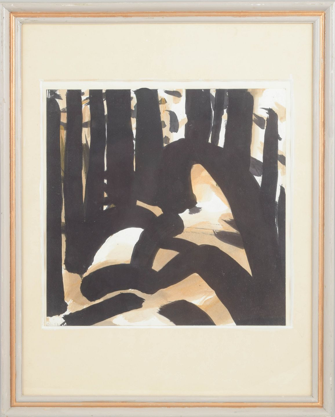 Cissi Svärdström, mixed media på papir, svensk billedkunstner.Abstrakt komposition med kraftige sorte penselstrøg og organiske former udført i mixed media på papir. Værket med titlen “Ljus glänta” er signeret og dateret 1987.