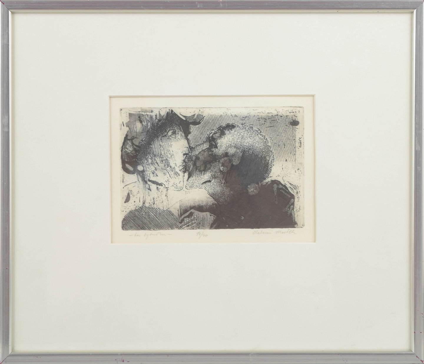 Skandinavisk kunstner, litografi.Ekspressivt figurativt motiv udført som litografi med to figurer i tæt komposition, udført i sort og gråtoner med markante grafiske skraveringer. Signeret i blyant nederst, signaturen er vanskelig at tyde, og nummereret 14/40.