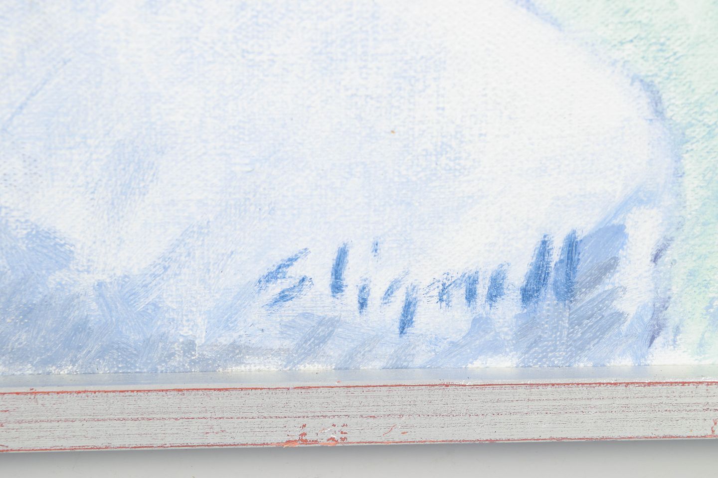 Sven Lignell, oliemaleri på lærred, svensk modernist.Landskabsmotiv udført i dæmpede, lyse farvetoner med en stiliseret gengivelse af klippeformationer i forgrunden og vand samt fjern horisont i baggrunden. Kompositionen er karakteriseret ved en rolig, næsten grafisk opbygning og en reduceret farvepalet typisk for nordisk modernistisk landskabsmaleri fra midten af det 20. århundrede.
