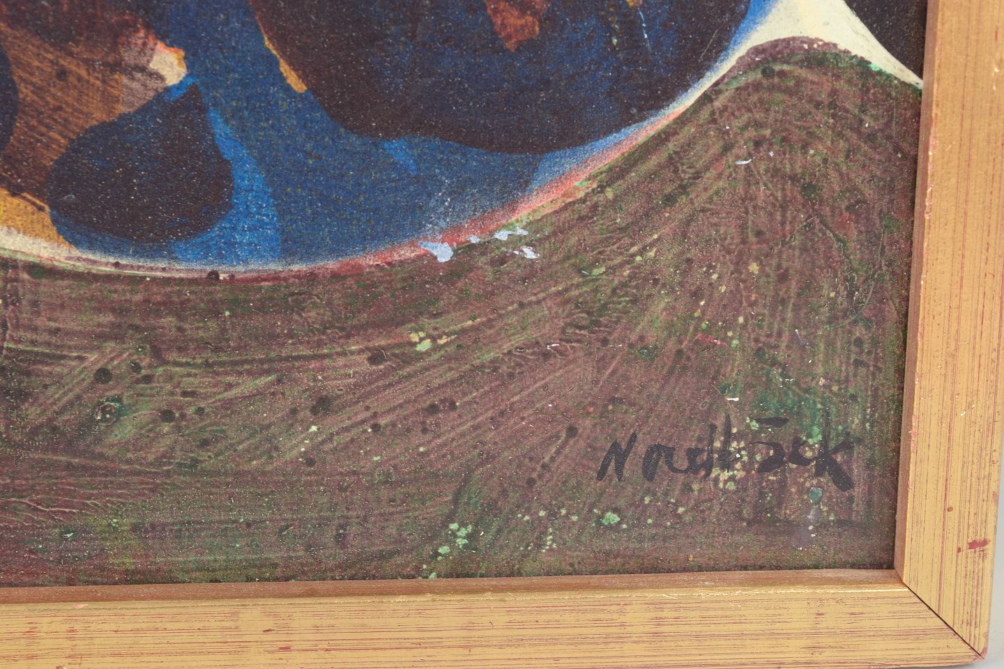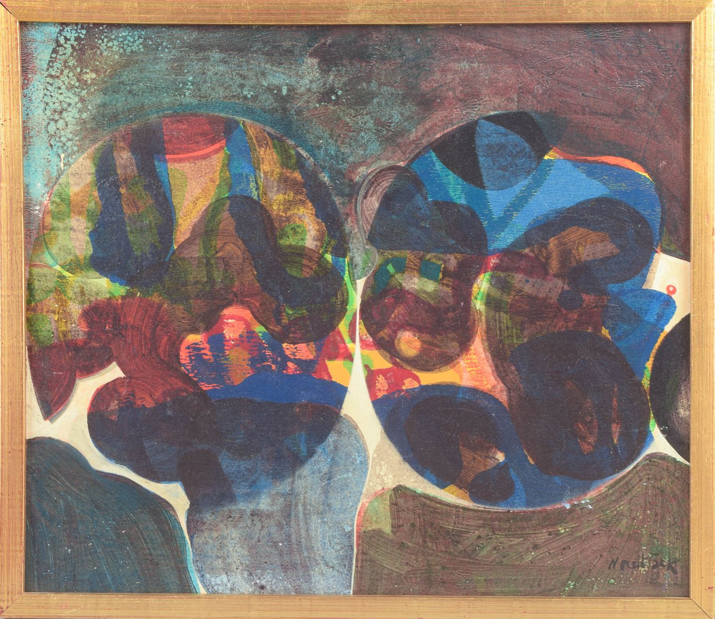 Tomas Nordbäck, oliemaleri på plade, svensk billedkunstner.Abstrakt komposition udført i olie på plade med organiske former og stærke farvefelter i blå, røde, grønne og gule toner. De overlappende former og kontrasterende farver skaber en dynamisk billedflade med tydelige spor af 1970’ernes nordiske modernisme.