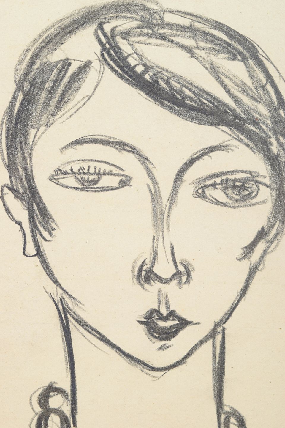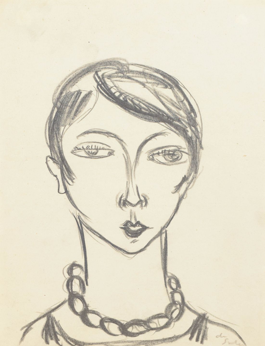 Eugène de Sala, tegning.Art deco portrættegning udført på papir med elegant og økonomisk linjeføring. Motivet viser et stiliseret kvindeportræt med kort frisure og halskæde, gengivet i en enkel grafisk stil typisk for 1930’ernes modernistiske tegnekunst.