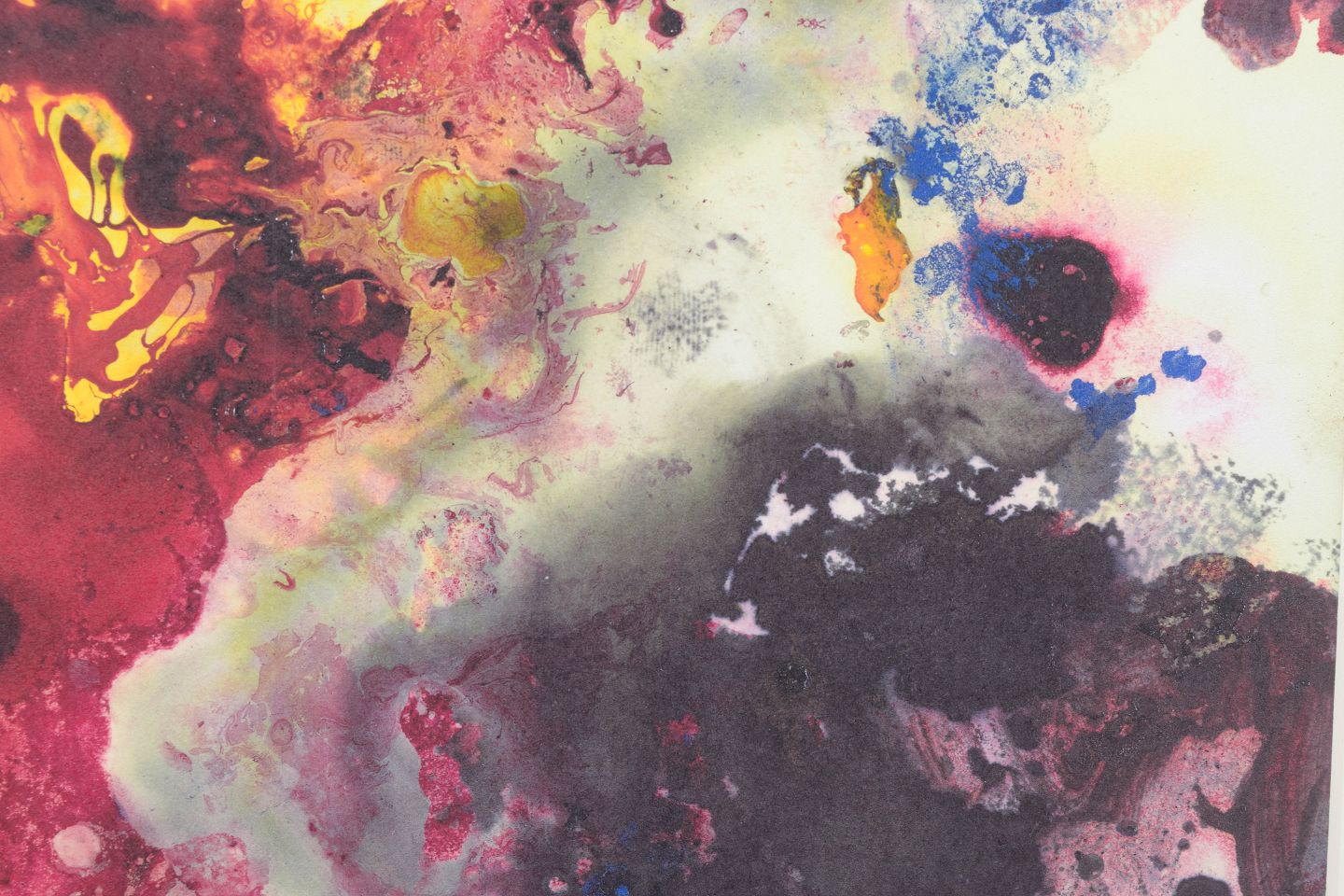Gerhard Richter, farvetryk, tysk kunstner.Abstrakt komposition udført som farvetryk med dynamiske farvefelter i intense røde, gule, blå og mørke toner. Motivet har en flydende og eksplosiv karakter med organiske former og transparente lag. Signeret i blyant, dateret 2022.