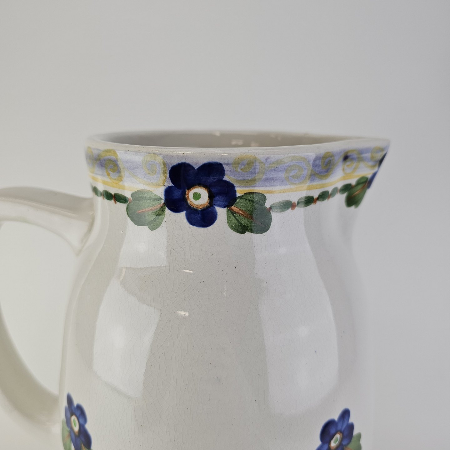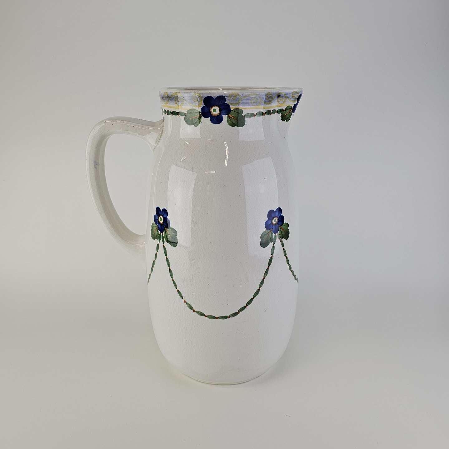 Stellet er i hvid fajance og håndmalet med dekoration af blå violer