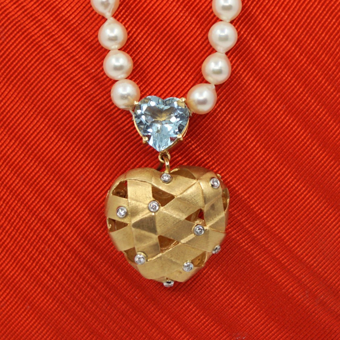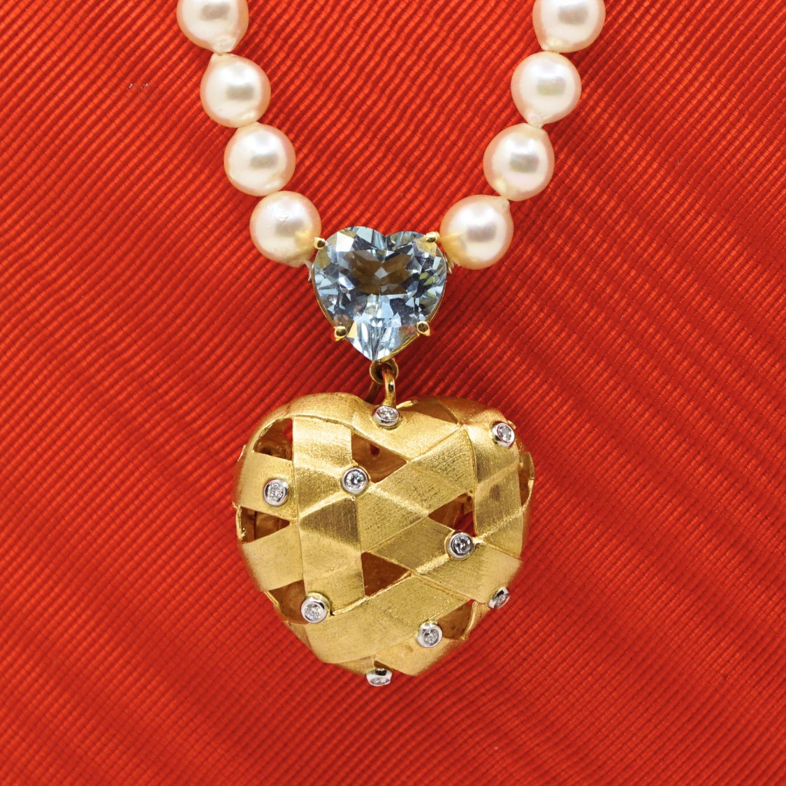 Ole Lynggaard; Smykkelås sammensat af to hjertelåse. Flettet hjertelås i 14 kt. guld med 9 diamanter. Samt hjertelås i 18 kt. guld med lyseblå sten.Flettet hjertelås: 3,2 x 3,1 cm.