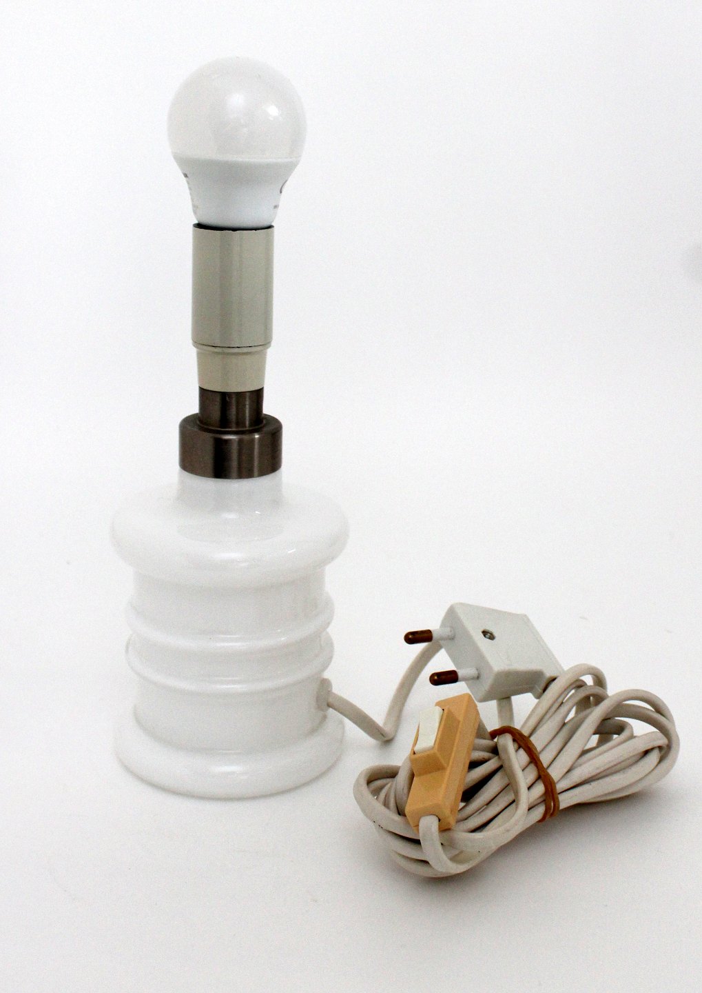 Holmegaard, Apoteker serien, hvid opaline reollampe. Designet af Sidse Werner 1985. Højde 19 cm. incl fatning 19 cm. Diameter 8 cm. Hvid ledning med beige afbryder. Sjælden størrelse. Pris: 475 kr. Udstiller