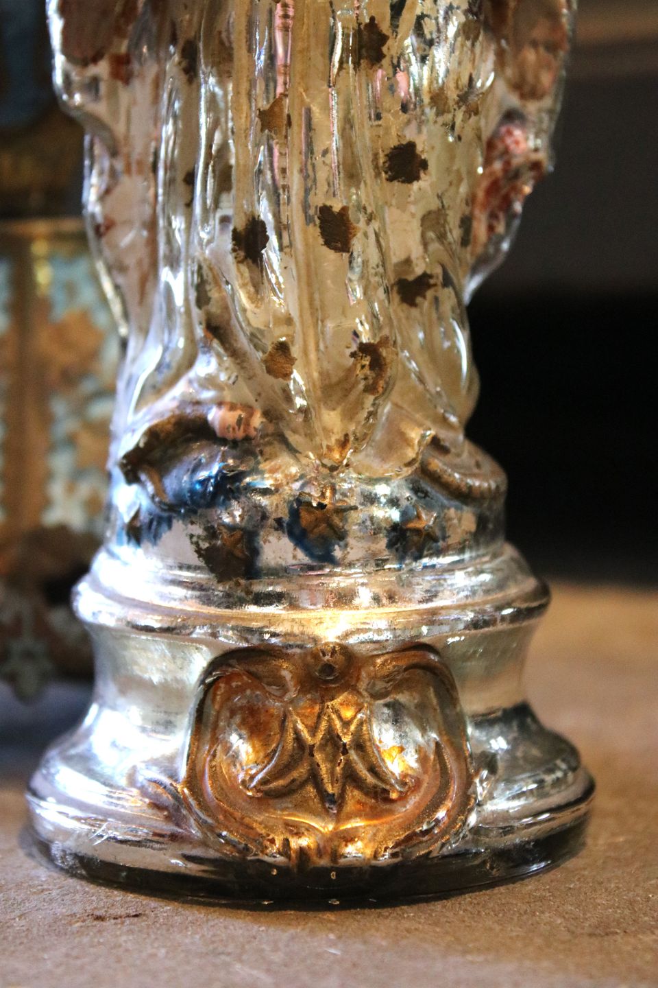 Antik 1800 tals Madonna figur i fattigmandssølv / Mercury glass med fin gammel bemaling...