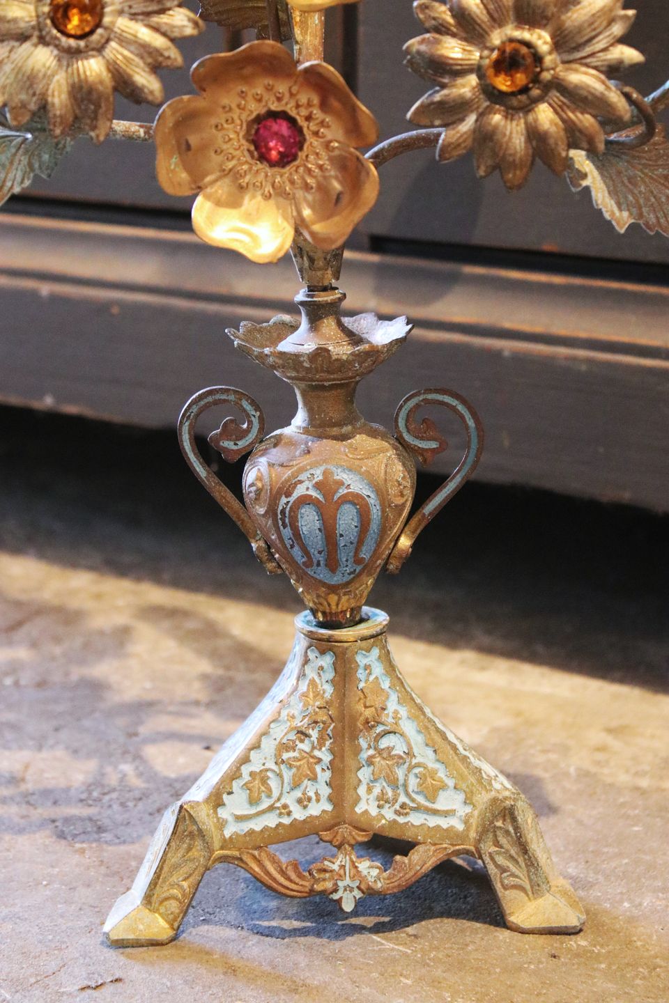 Antik , fransk kirkestage med plads til 5 stearinlys og dekoreret med 8 fine metal blomster med farvet sten. H: 55cm. B: 28cm.Emne nummer: Stage nr.1
