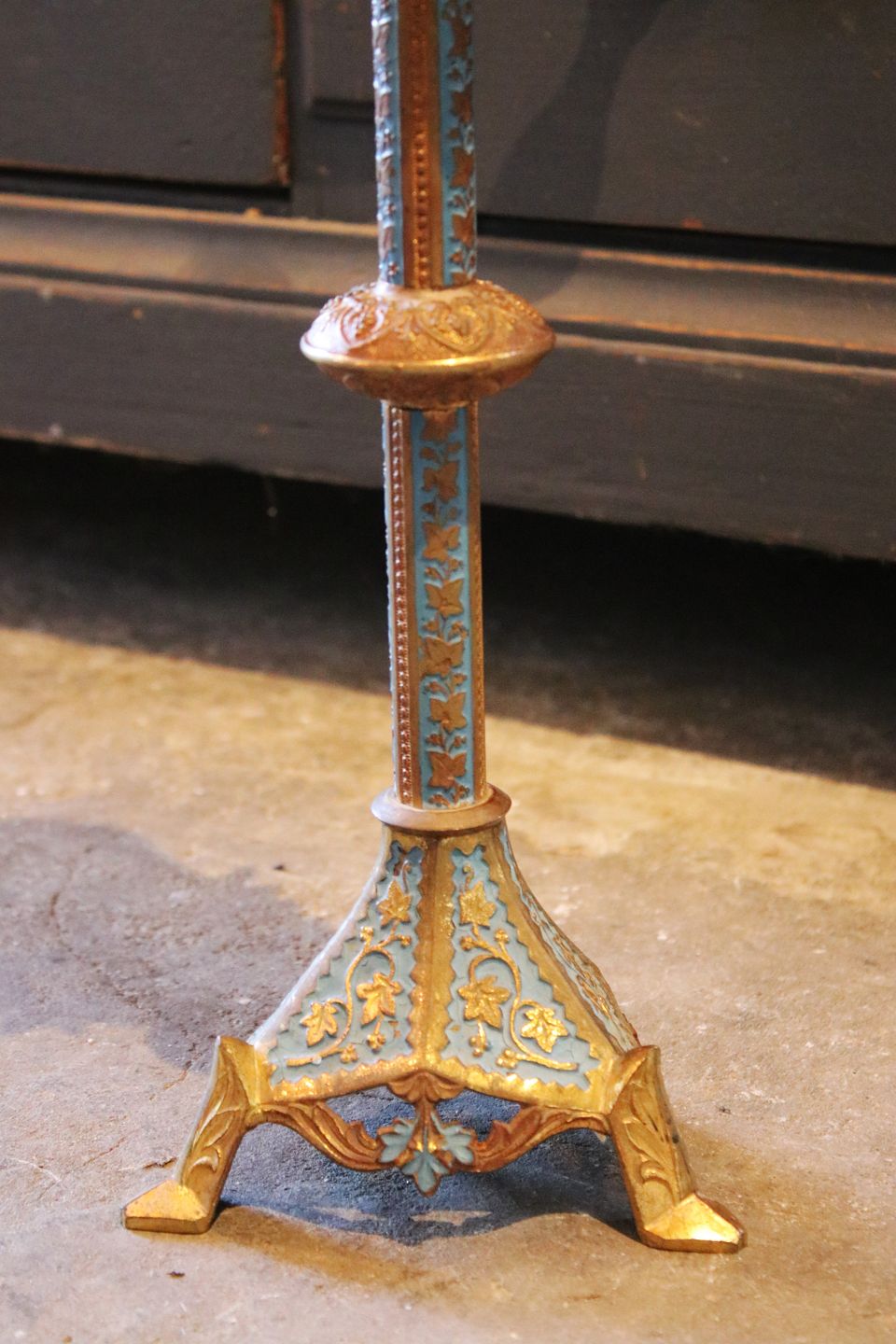 Antik fransk kirkestage til et bloklys i messing med turkisblå bemaling. H: 35cm. Udstiller