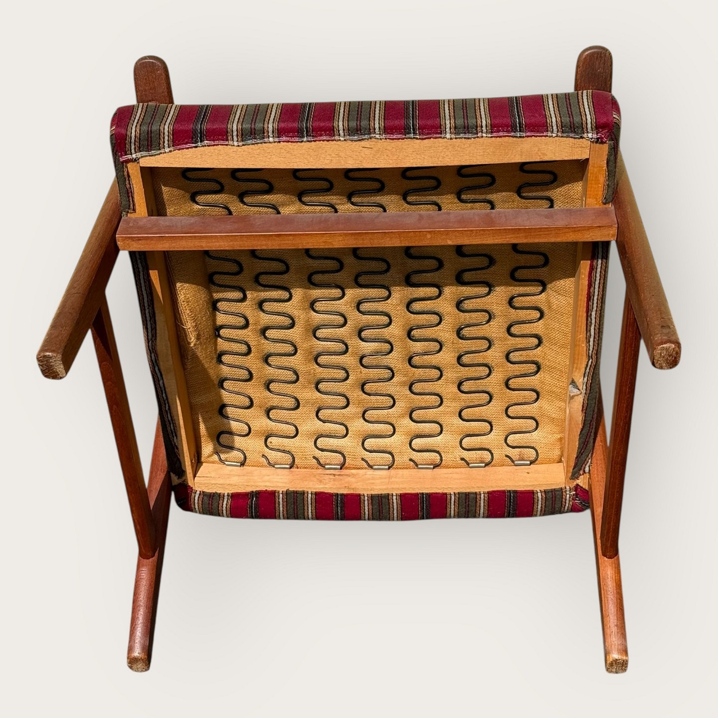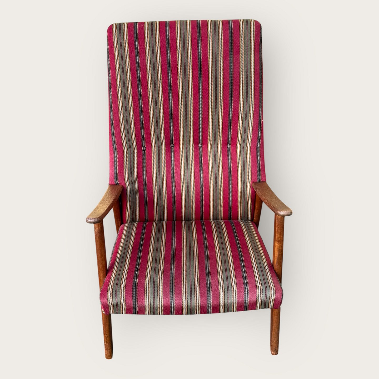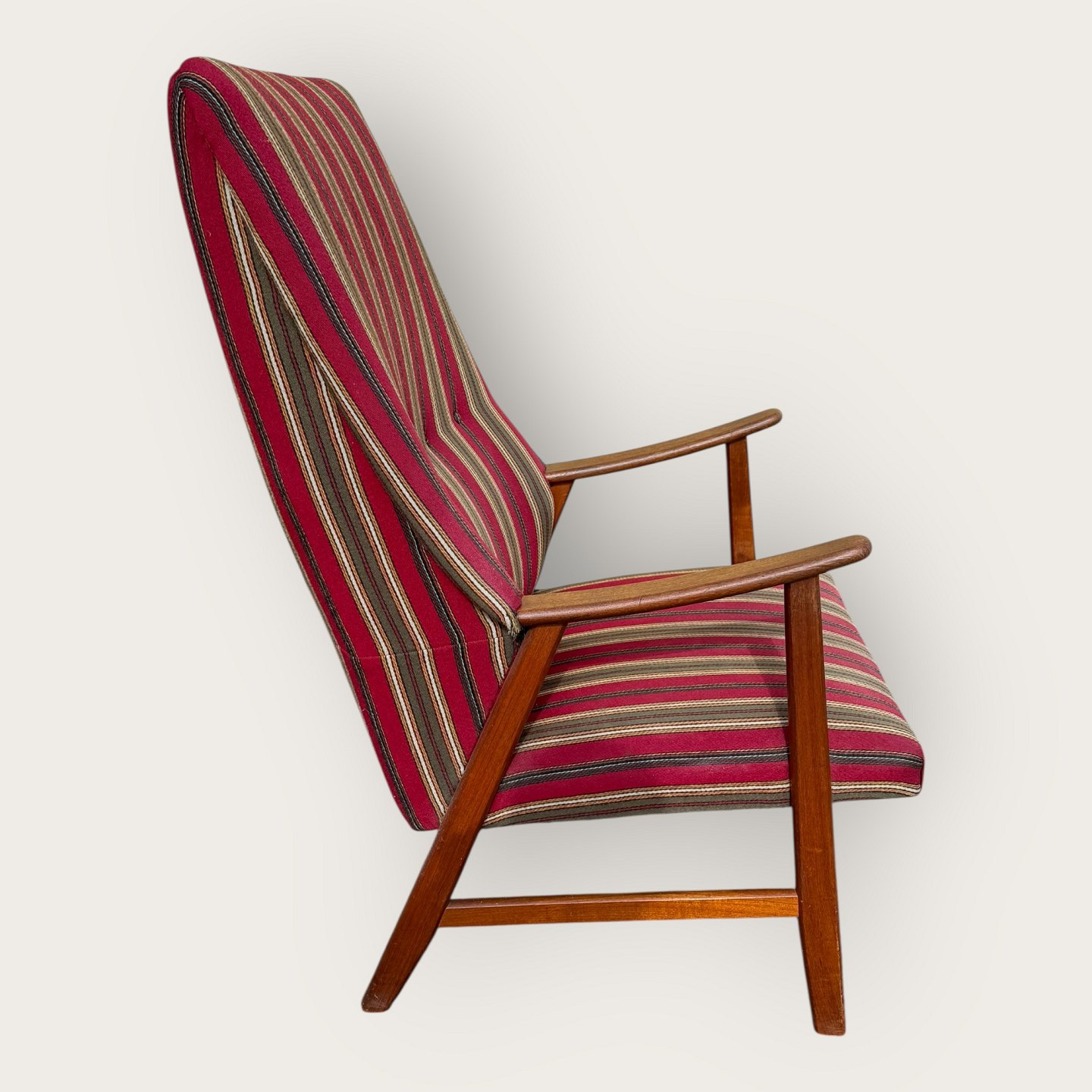 Lænestol i teaktræ og stof, sædehøjde 36cm, bredde 62cm, ryglæn højde 103cm, scandinavian modern fra 1960'erne *pæn stand*Lager: 1